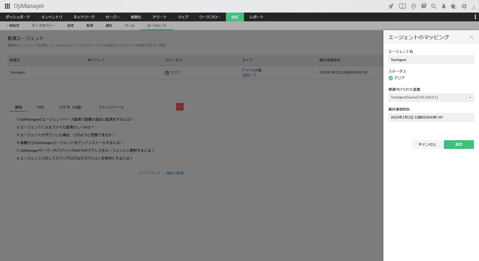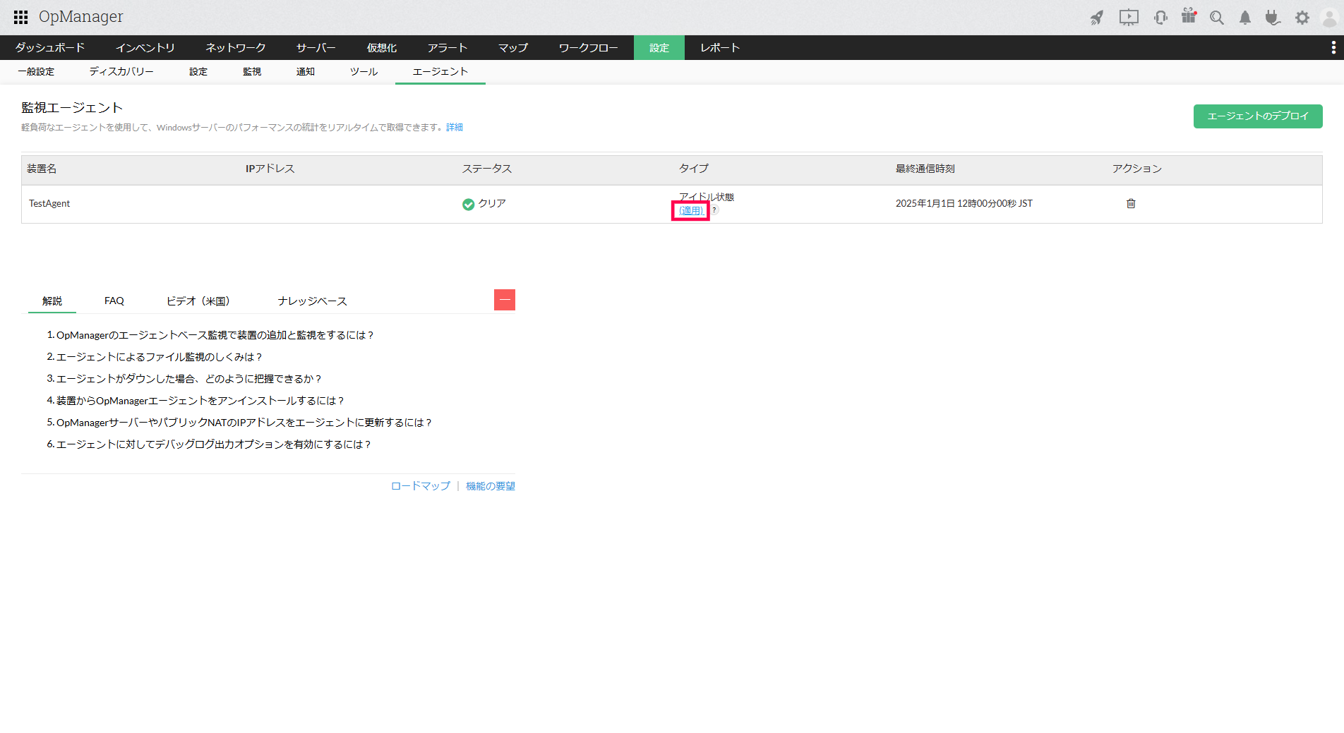 - [設定]→[エージェント]→[監視エージェント]に移動します。