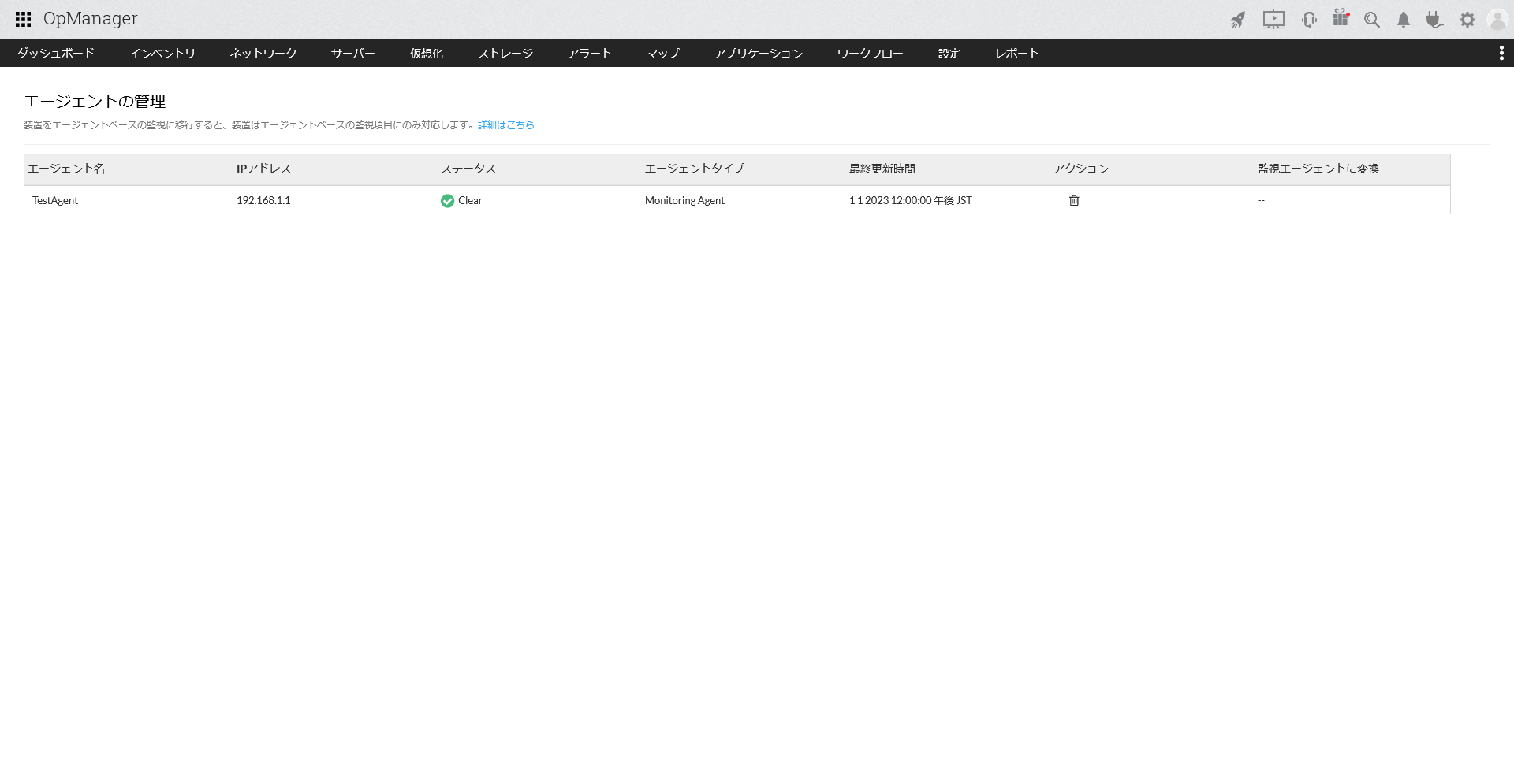 https://(OpManagerサーバーのIPまたはFQDN):(Webサーバーポートの番号)/apiclient/ember/index.jsp#/Support/AgentList[エージェントの管理]ページが開かれ、インストール済の全てのエージェントが表示されます。