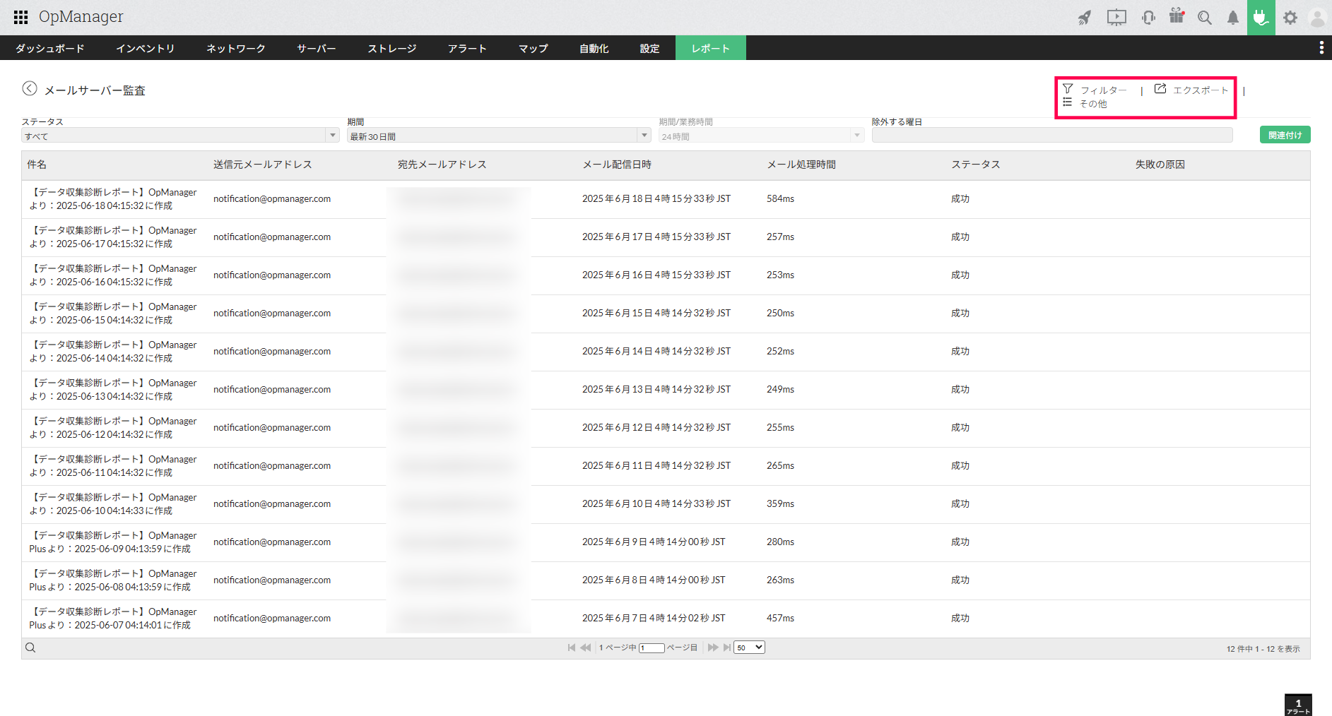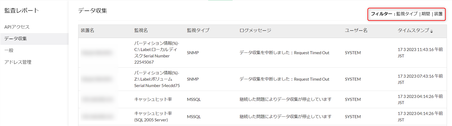 右上のフィルター機能で、監視タイプ、期間、装置ごとに表示条件を指定できます。