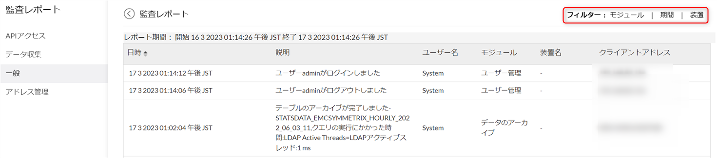 右上のフィルター機能で、モジュール、期間、装置ごとに表示条件を指定できます。