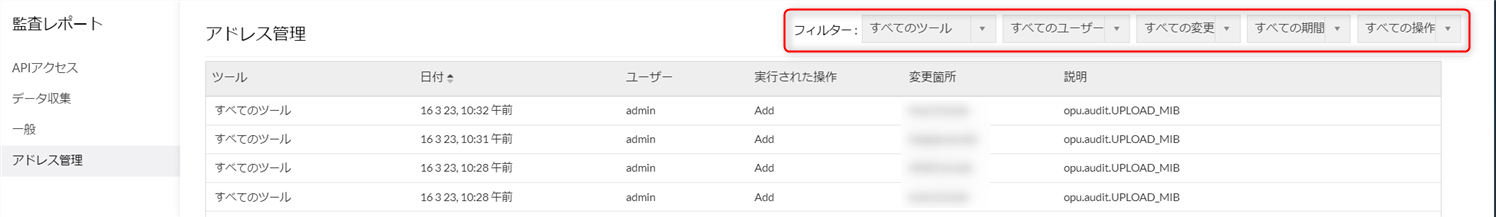 右上のフィルター機能で、ツールタイプ、変更種別、期間および操作種別ごとに表示条件を指定できます。