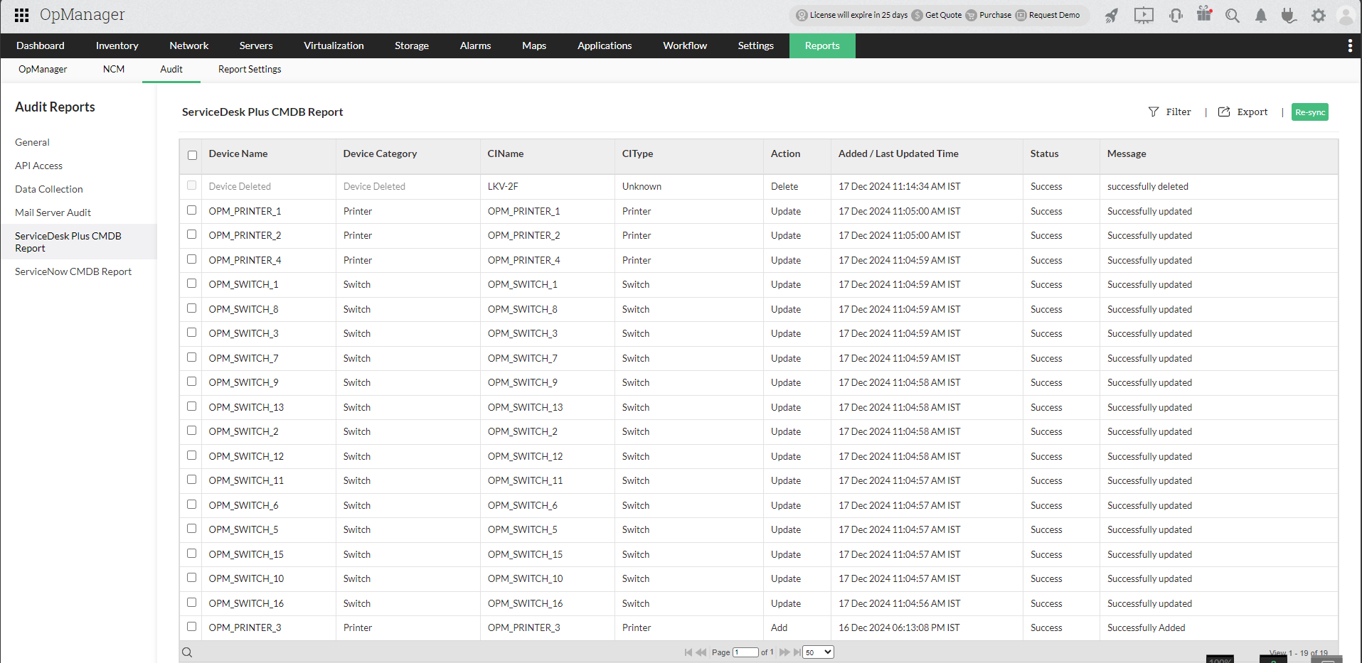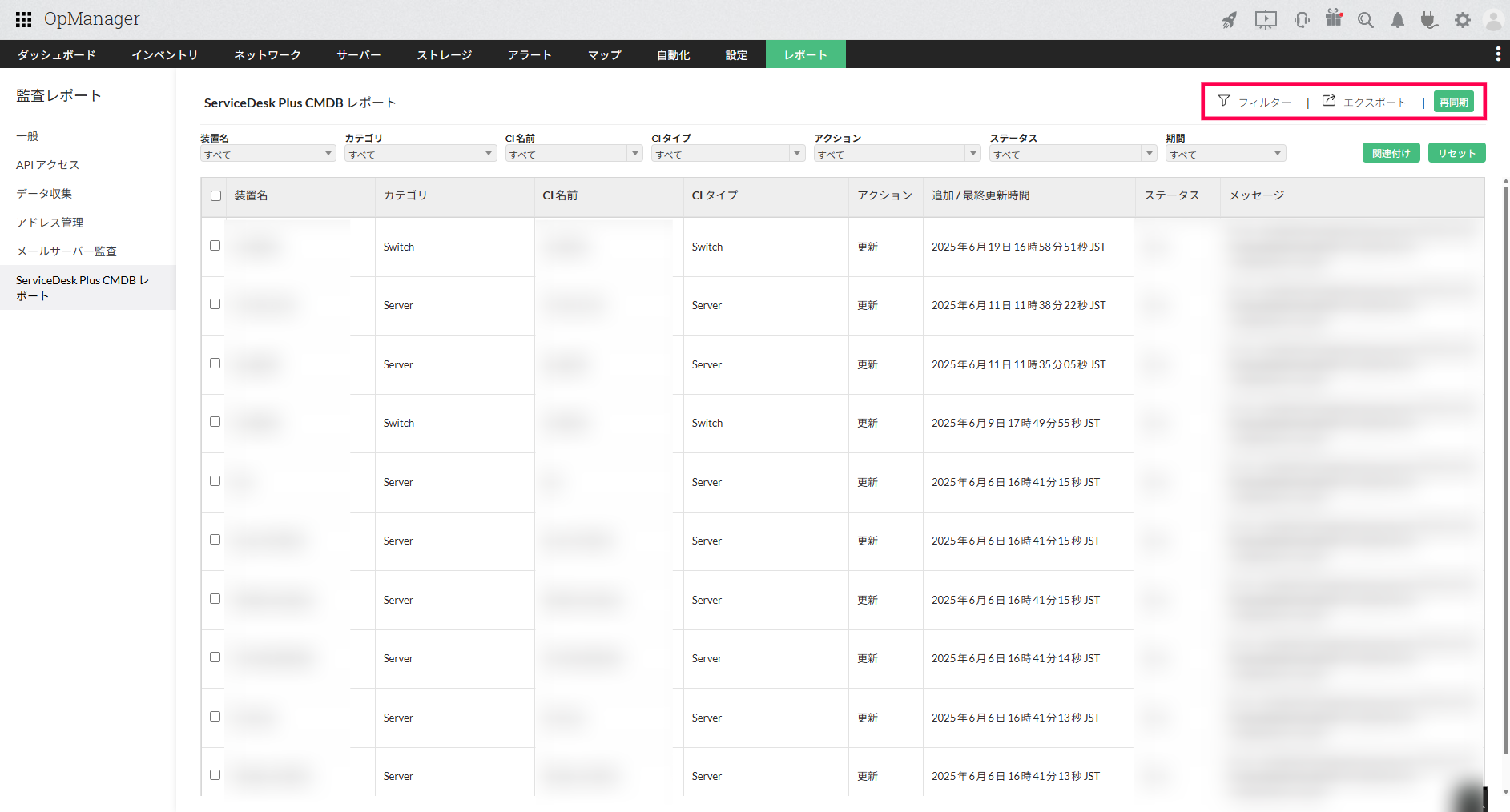 ServiceDesk Plus(オンプレミス版)との連携を行っている環境において、OpManagerから同期した装置の情報およびステータスを表示します。