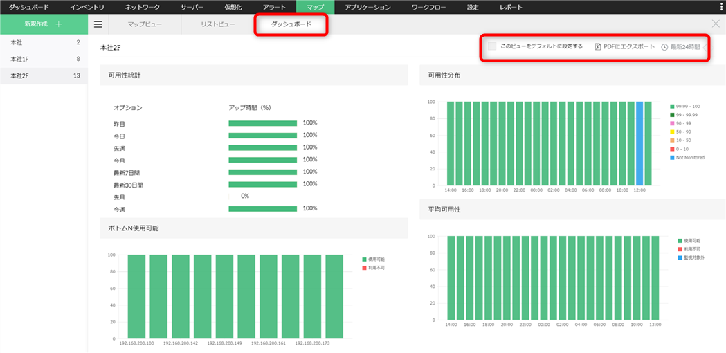 ダッシュボードでは、ビジネスビューに含まれる装置の可用性に関するデータをグラフ形式で表示します。