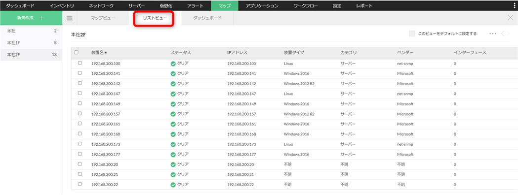 リストビューでは、ビジネスビューに含まれる装置の各種情報を表示します。