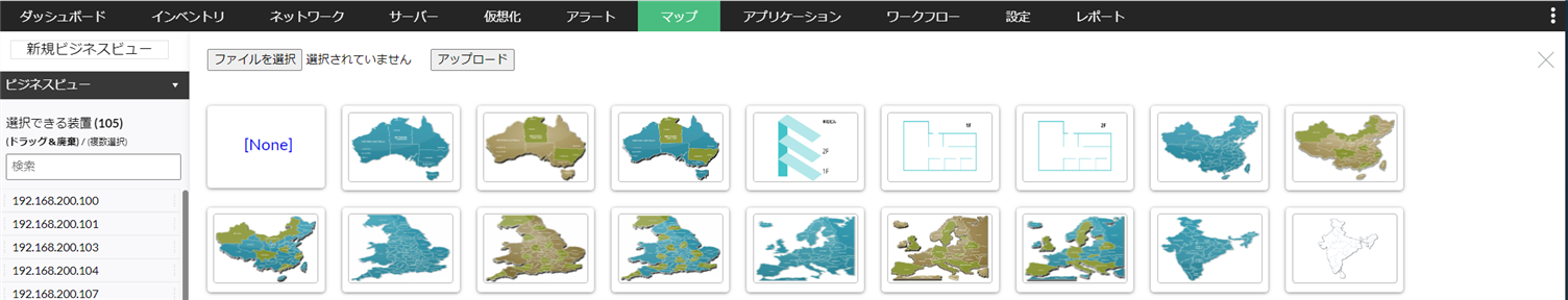 ファイルの形式はgif, png, jpeg, jpg、イメージの解像度は約1000×1000以下、サイズは約150KB以下を推奨しております。 - [選択できる装置]からビジネスビューに追加する装置を配置