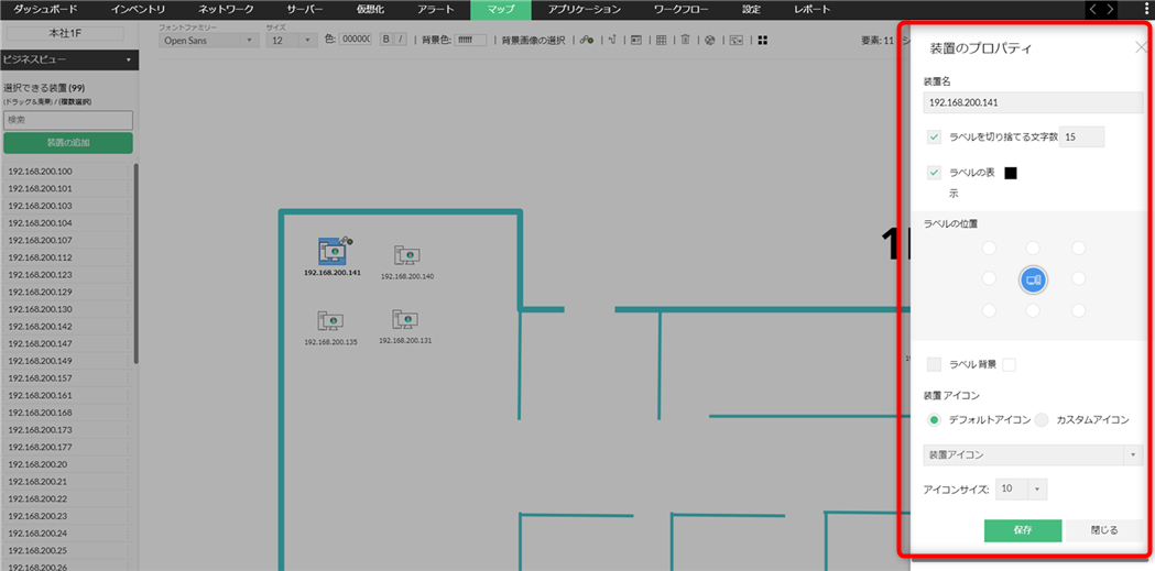 - 配置した装置をダブルクリックし、各種プロパティを編集し[保存]をクリックします。