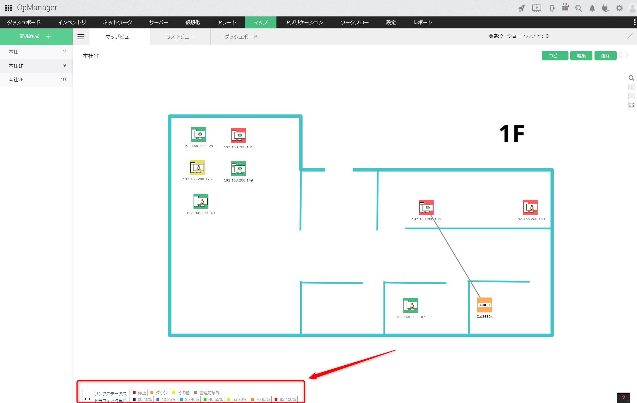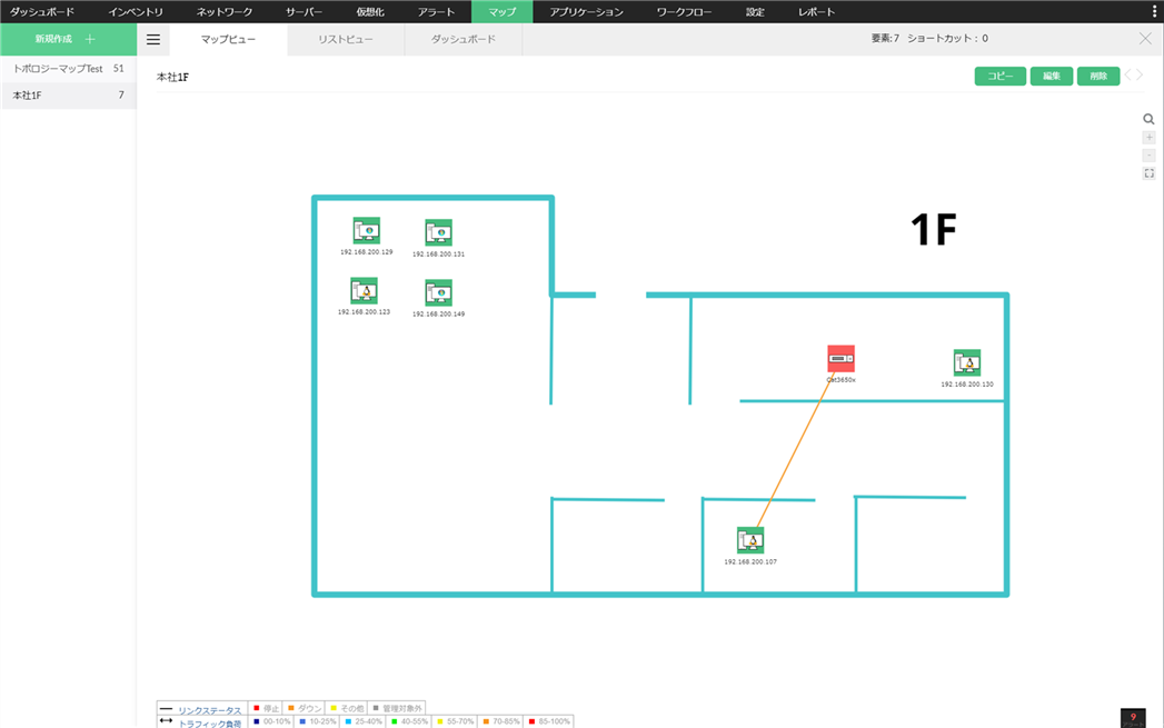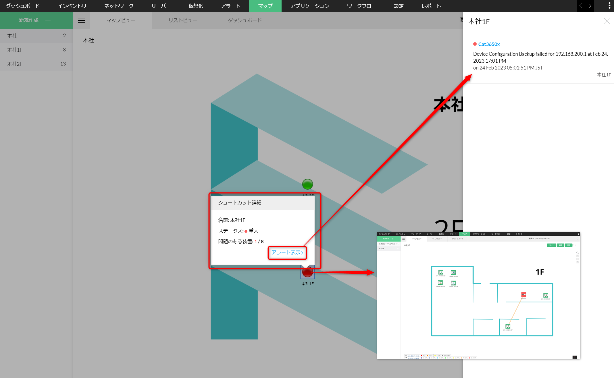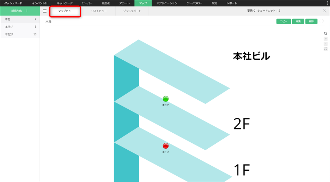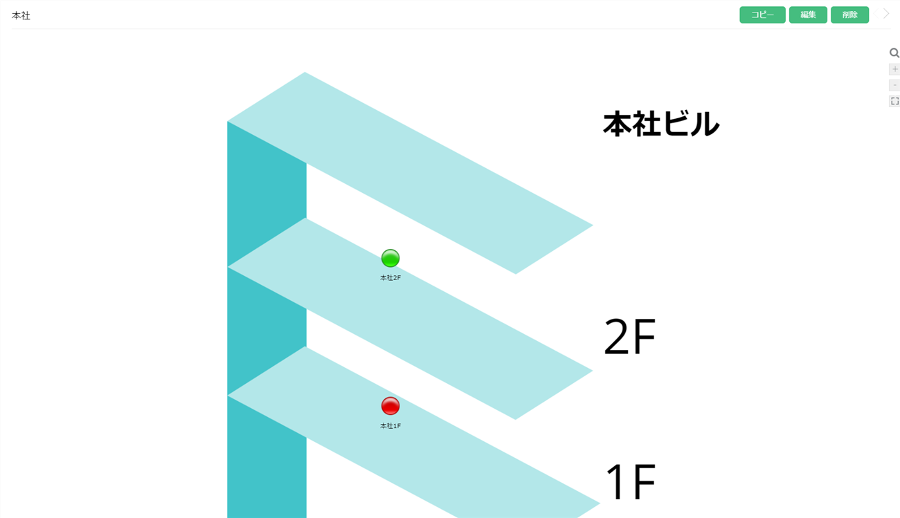 下の図では、「本社1F」のみに重大ステータスの装置があることが分かります。