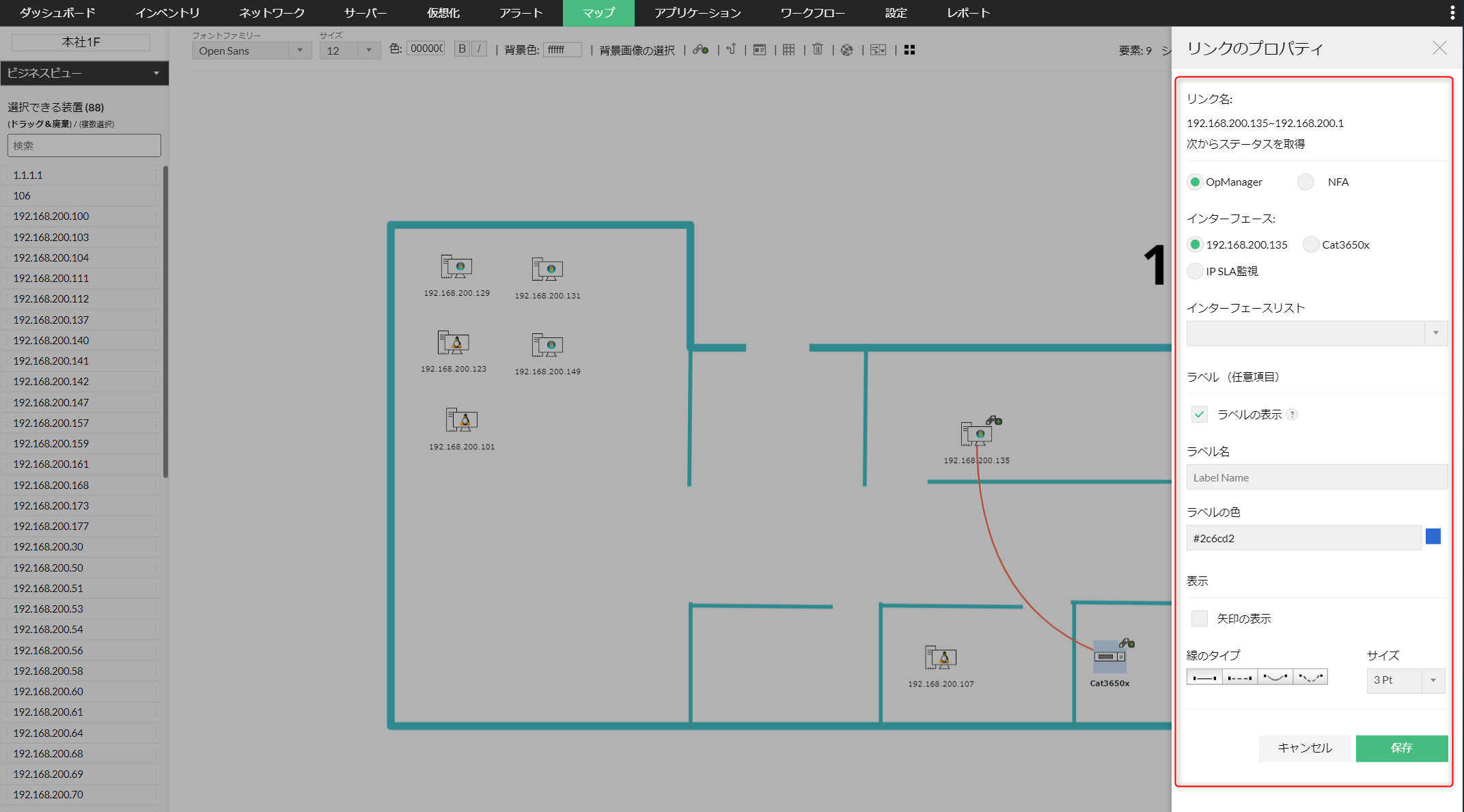 をクリックした状態で装置をドラッグし、リンク先装置のアイコン上にドロップすることでリンクを作成 - 表示されたウィンドウでリンクのプロパティを編集し[保存]をクリックします。