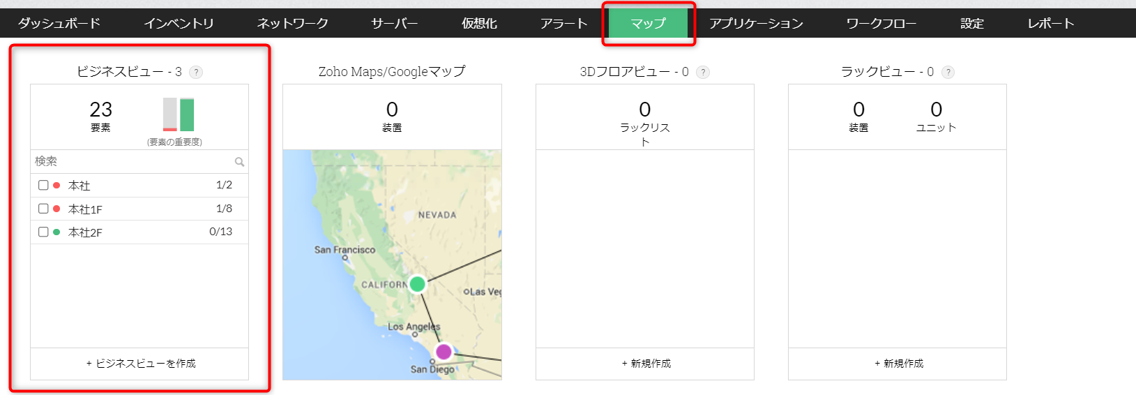 ビジネスビューに配置されている要素の個数、重要度ごとの装置数を確認できます。 -