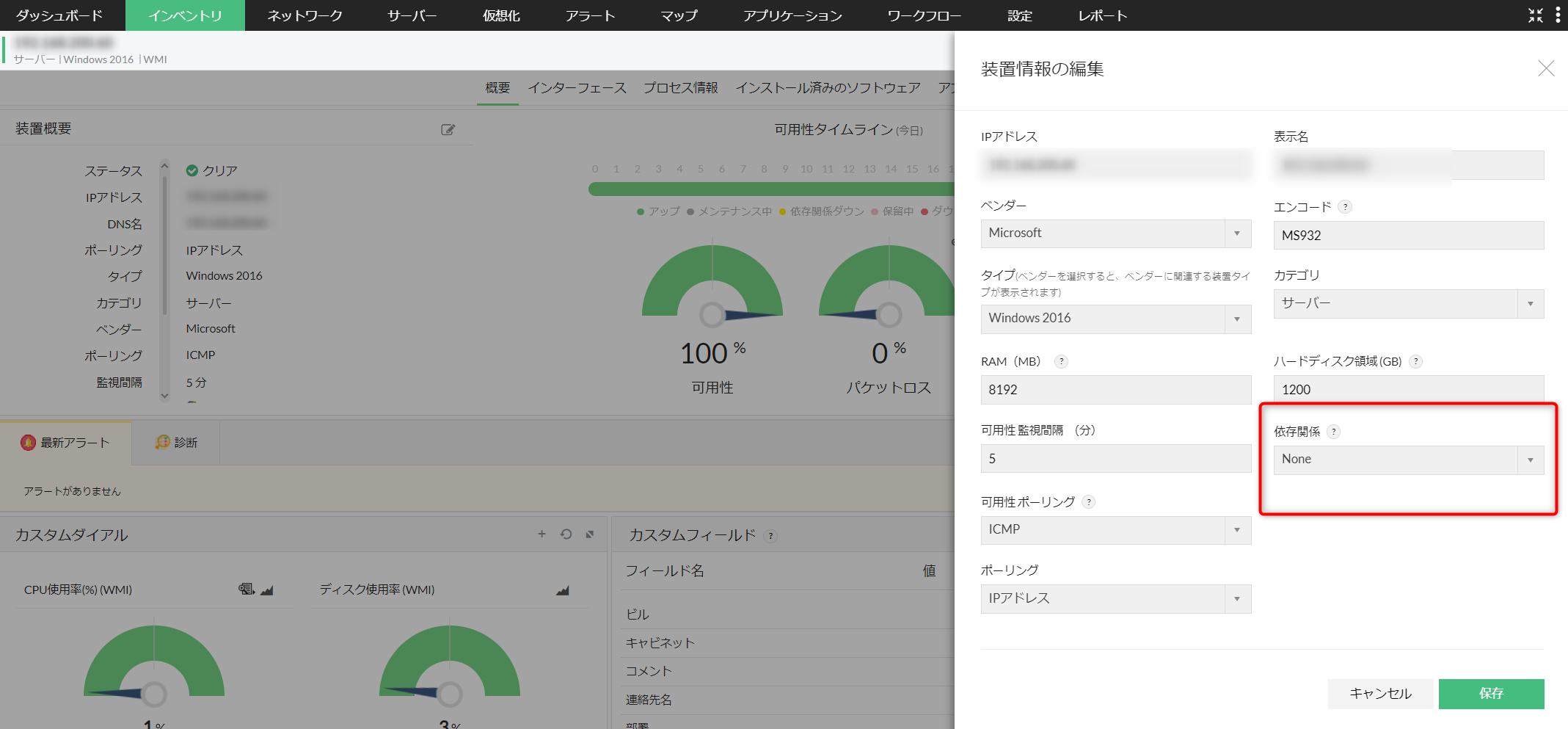 装置への接続可否が上位装置の状態に依存する構成の環境において、上位装置を依存関係に登録すると、装置のステータスの決定に上位装置のステータスが考慮されます。