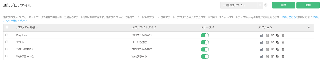 通知プロファイルの各種アクション