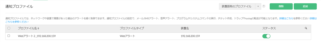 装置固有のプロファイルは、装置の概要ページから作成する、その装置専用の通知プロファイルです。