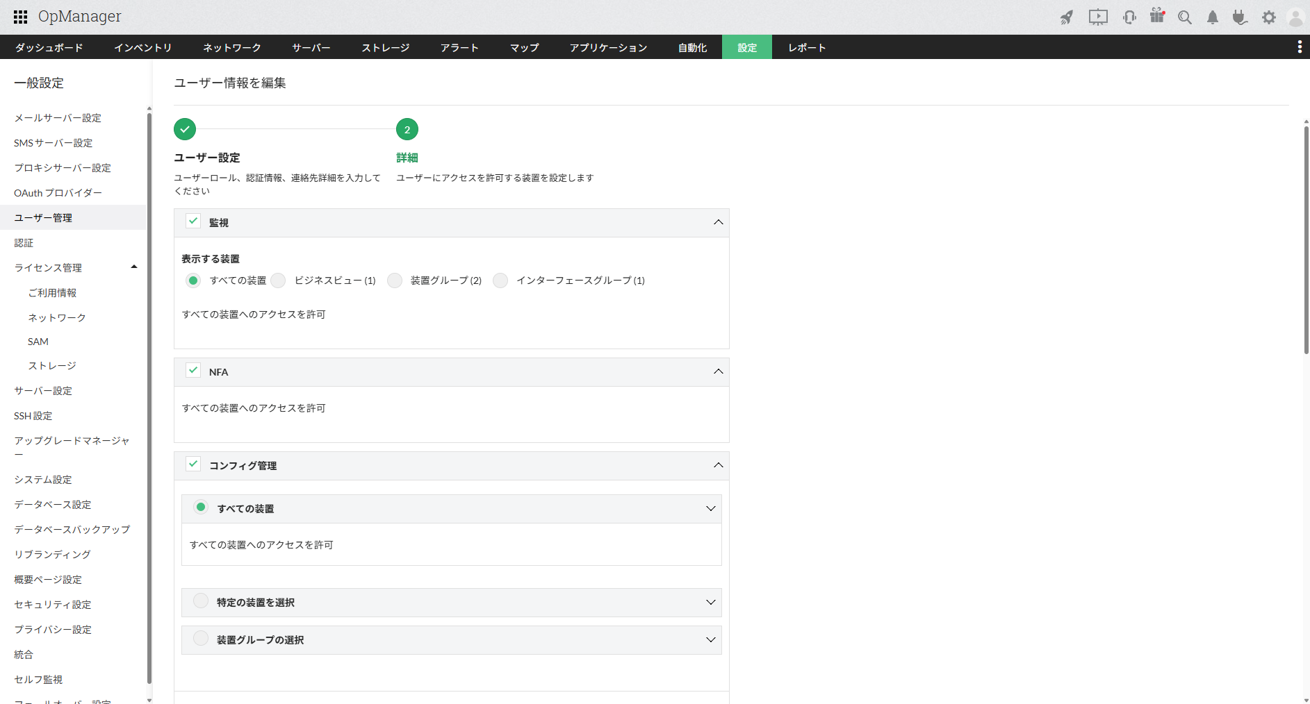 ユーザーの追加手順4で、すべてのオプション機能にチェックがついている、かつオプション内で[すべての装置]が選択されている