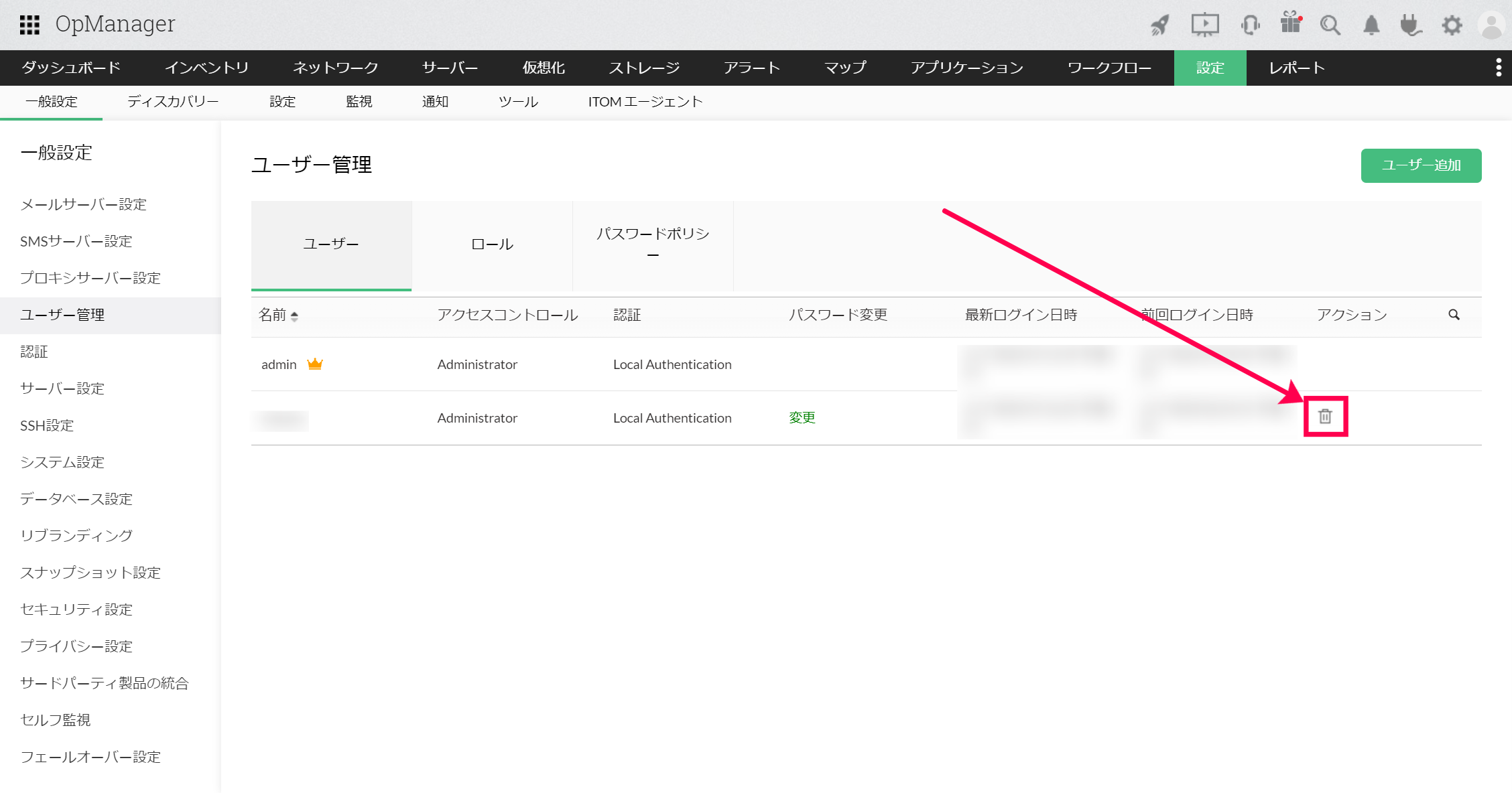ユーザーを削除するには、[設定]→[一般設定]→[ユーザー管理]→[ユーザー]に移動し、削除するユーザーの[アクション]配下のごみ箱アイコン