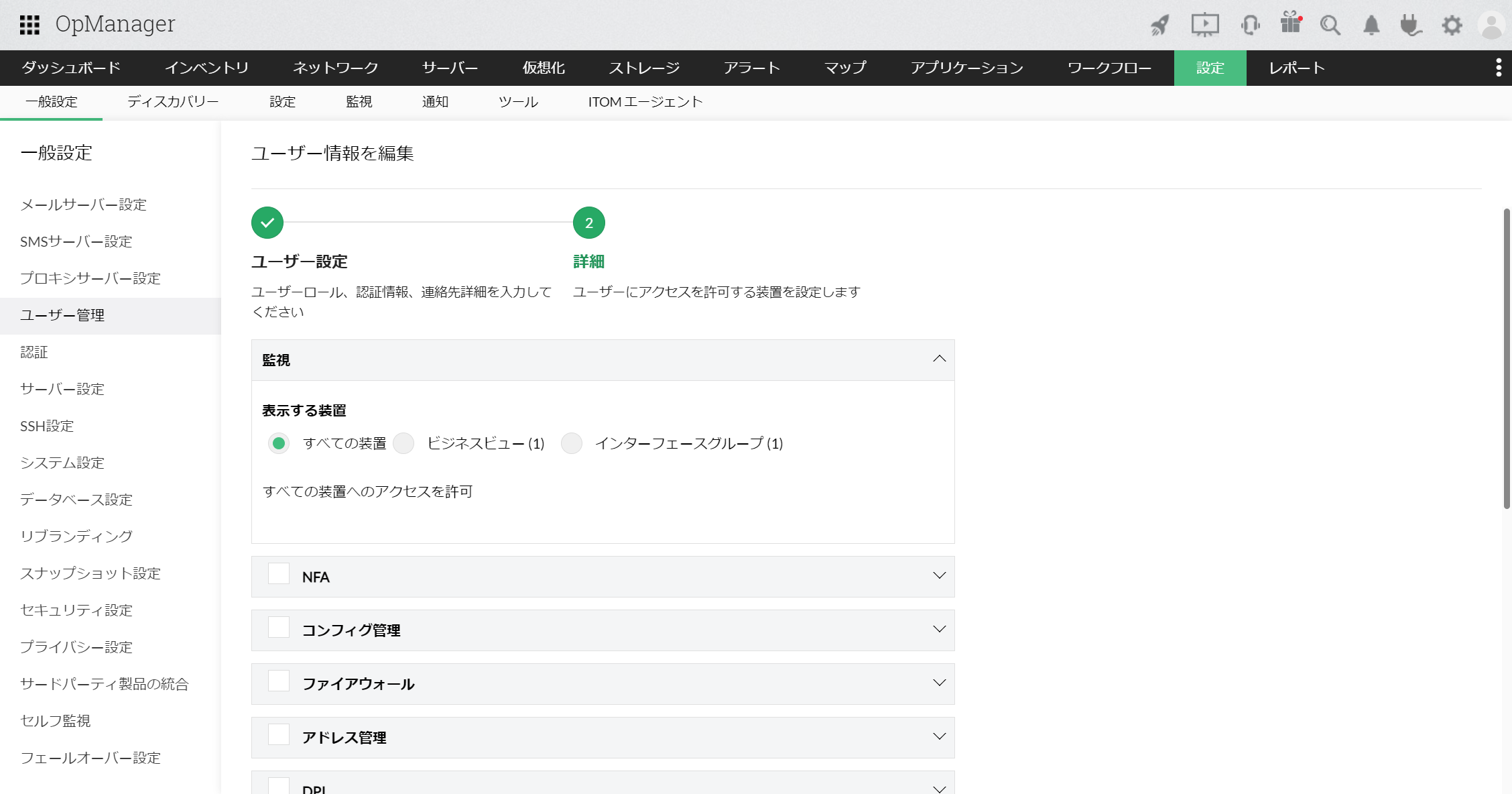 "admin"ユーザーとは異なり、OpManagerの一部設定へのアクセス等が制限されます。