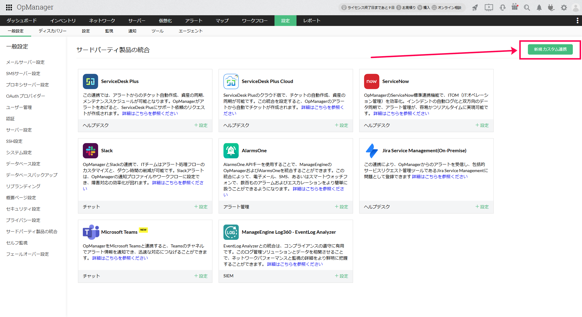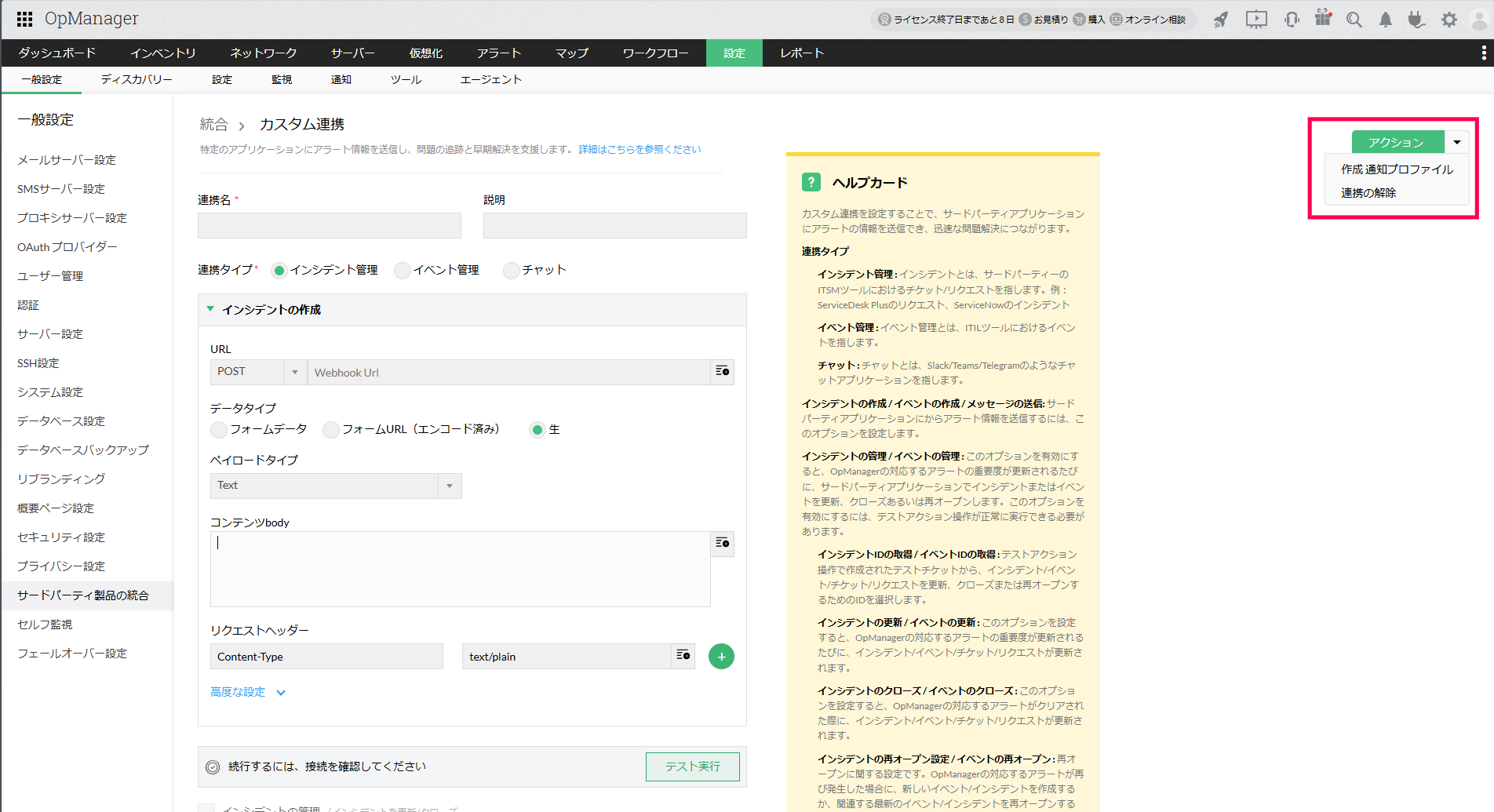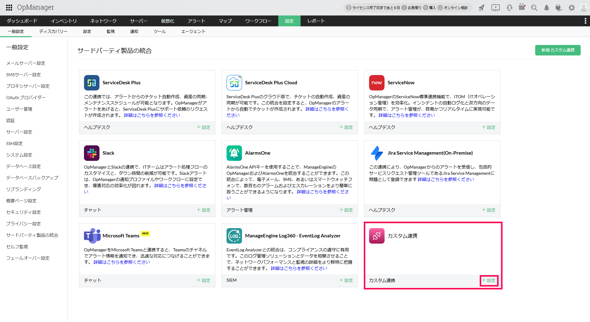 カスタム連携は、REST APIまたはWebhookのAPIに対応しているアプリケーションをOpManagerと連携するための設定です。
