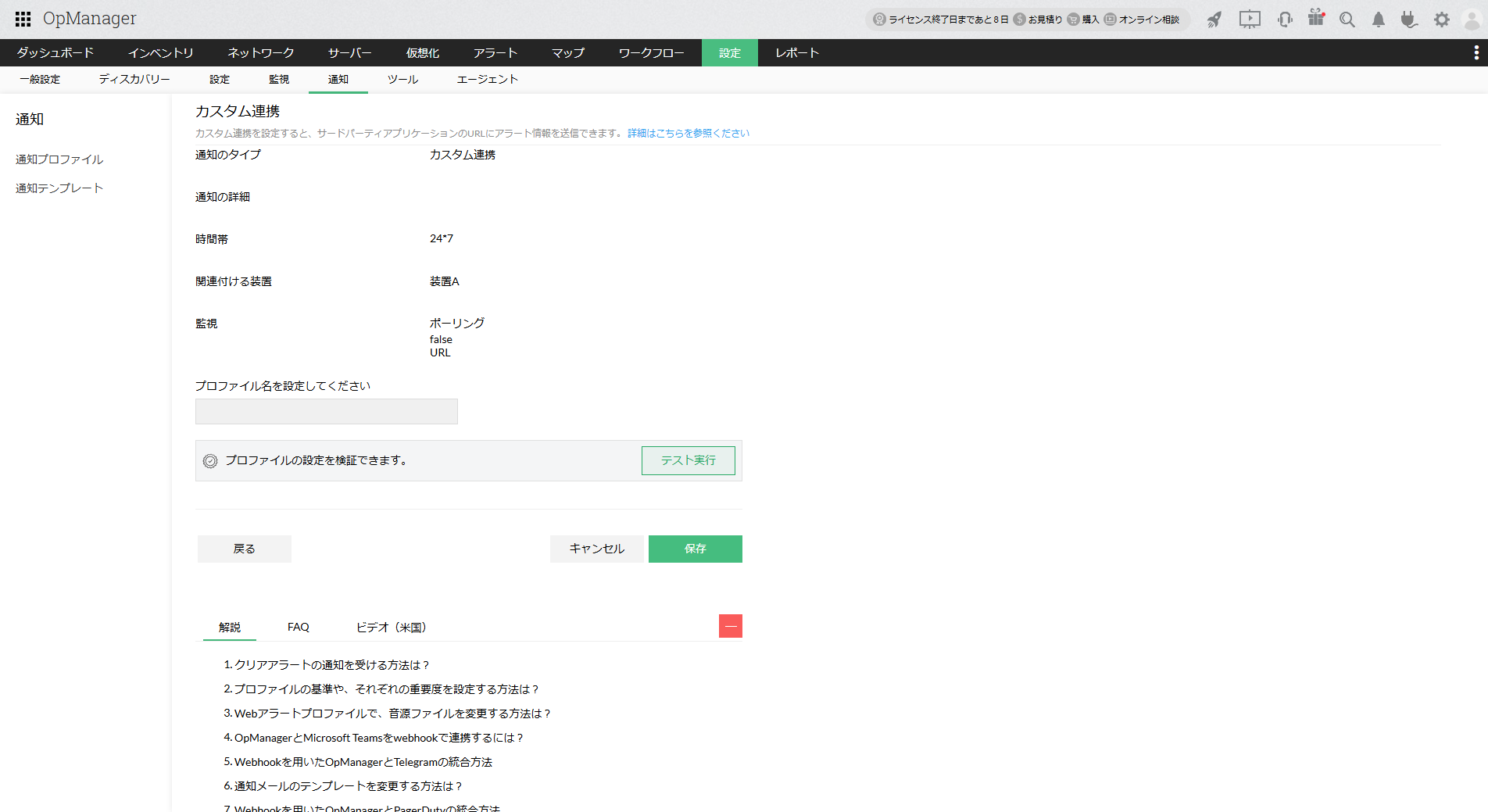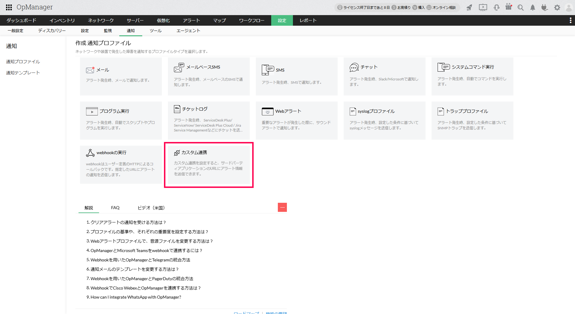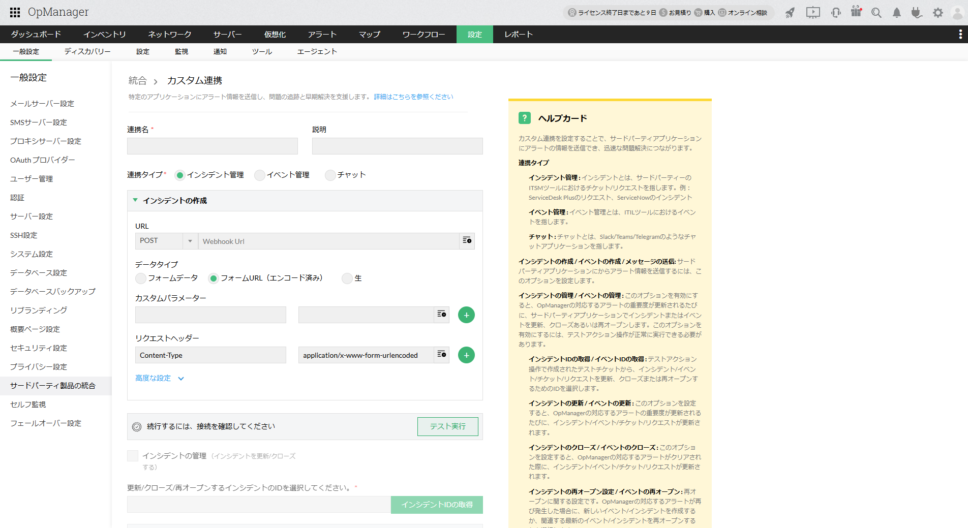 カスタム連携は、REST APIまたはWebhookのAPIに対応しているアプリケーションをOpManagerと連携するための設定です。