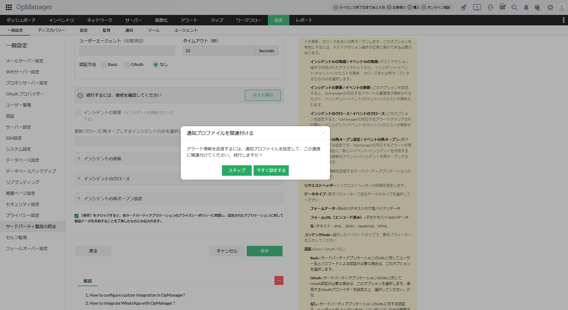 続けて行う場合は[今すぐ設定する]を、後で行う場合は[スキップ]を選択します。 - [連携名](OpManagerでのカスタム連携の名称)と[説明](カスタム連携の説明)を入力します。