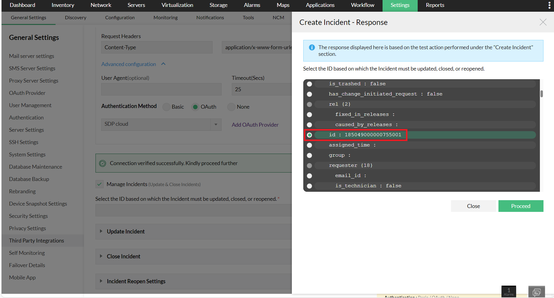 表示される応答から、インシデント/イベントのIDが確認できる行を選択して、[続行]をクリックします。