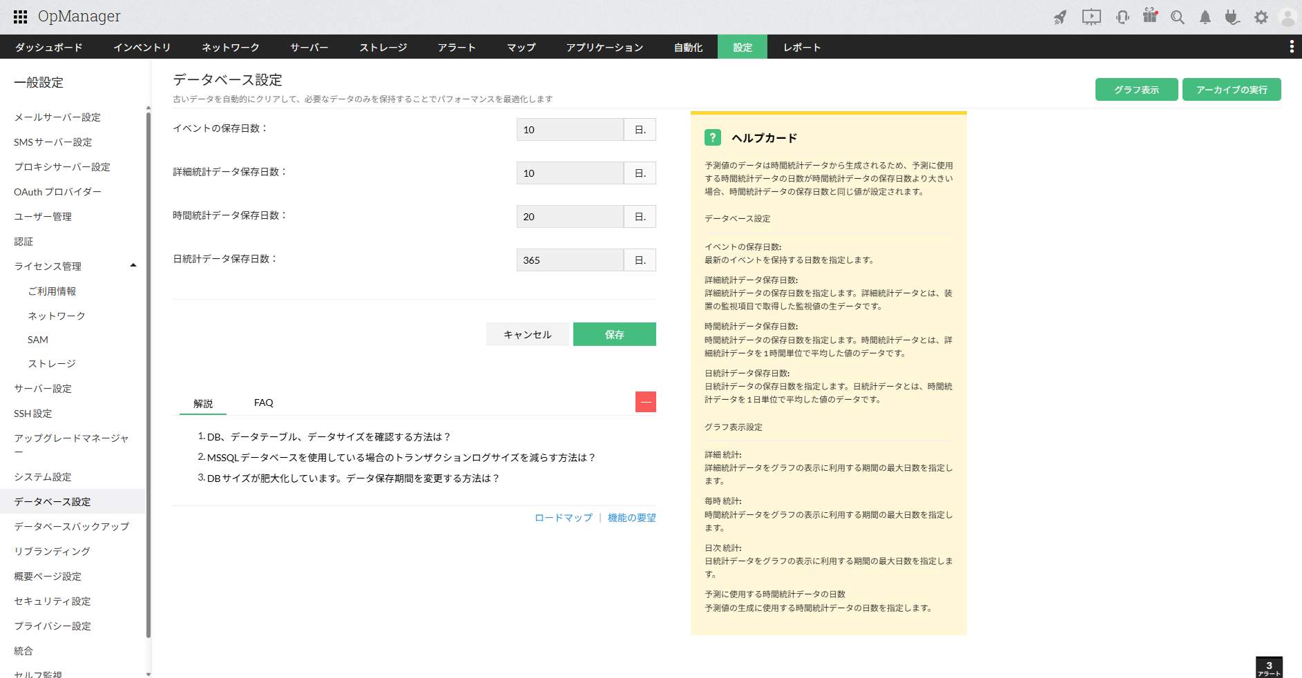 OpManagerは、収集したデータをデータベースに保存し、指定した期間に応じてデータの丸め込み処理やアーカイブを実行します。