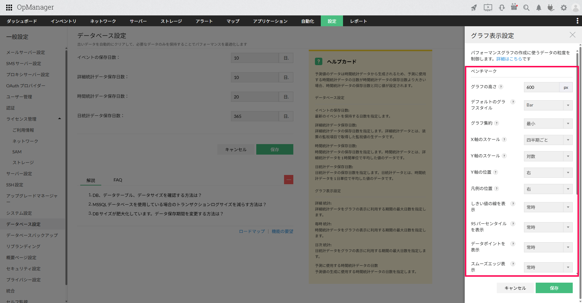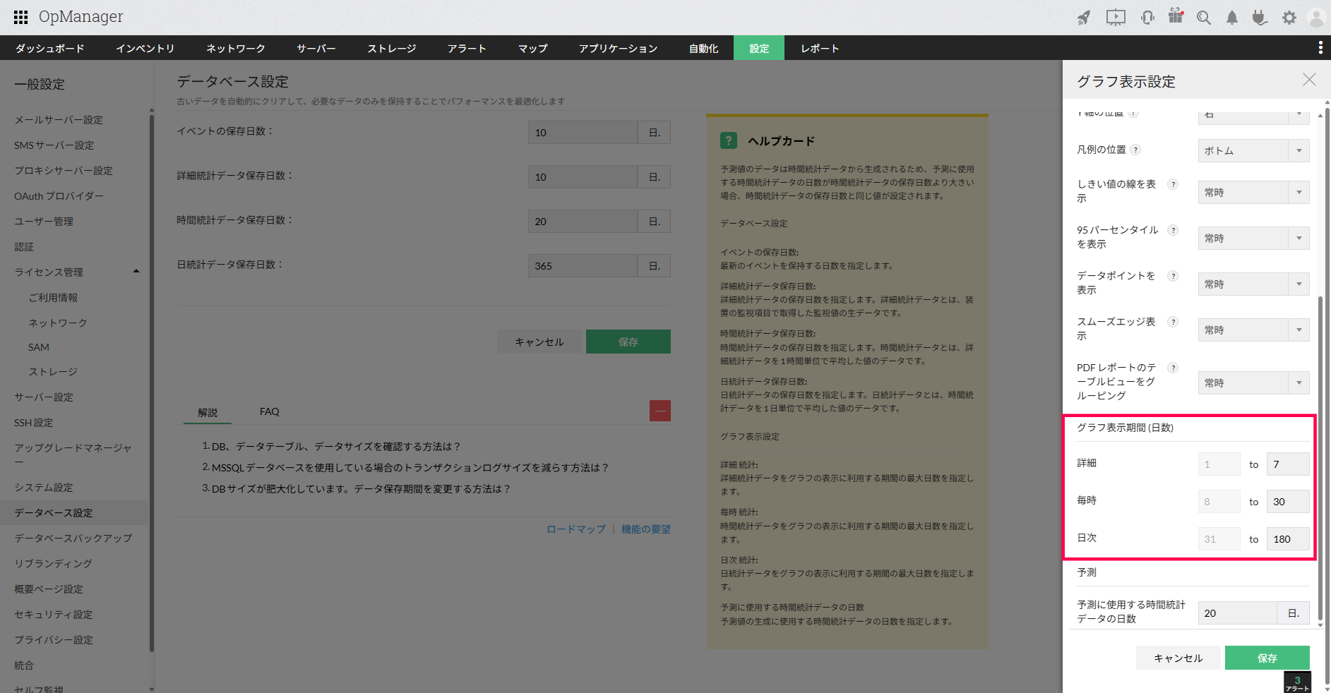 データベース設定ページ右上の[グラフ表示]から、パフォーマンスデータのグラフにおける表示の仕様や、グラフの描画における各統計データの使用期間を指定できます。