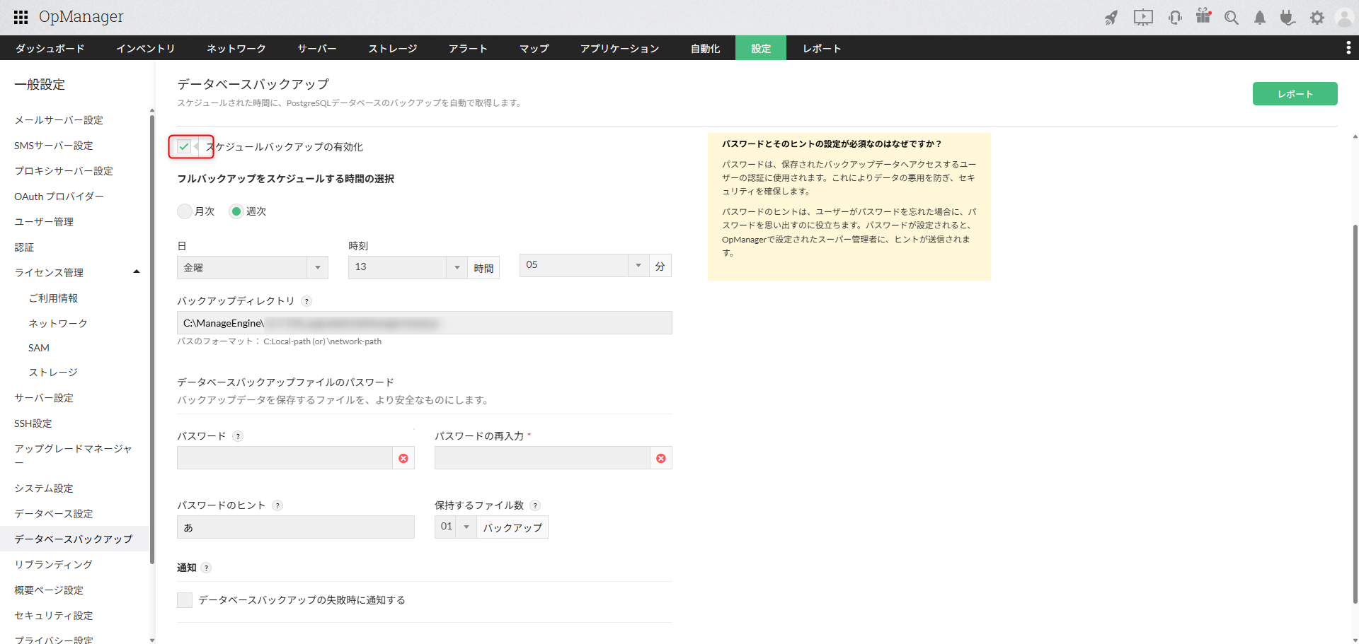 データベースバックアップ機能は、製品を停止することなく、PostgreSQLデータベースのバックアップをスケジュールされた時間に自動で生成し保管します。