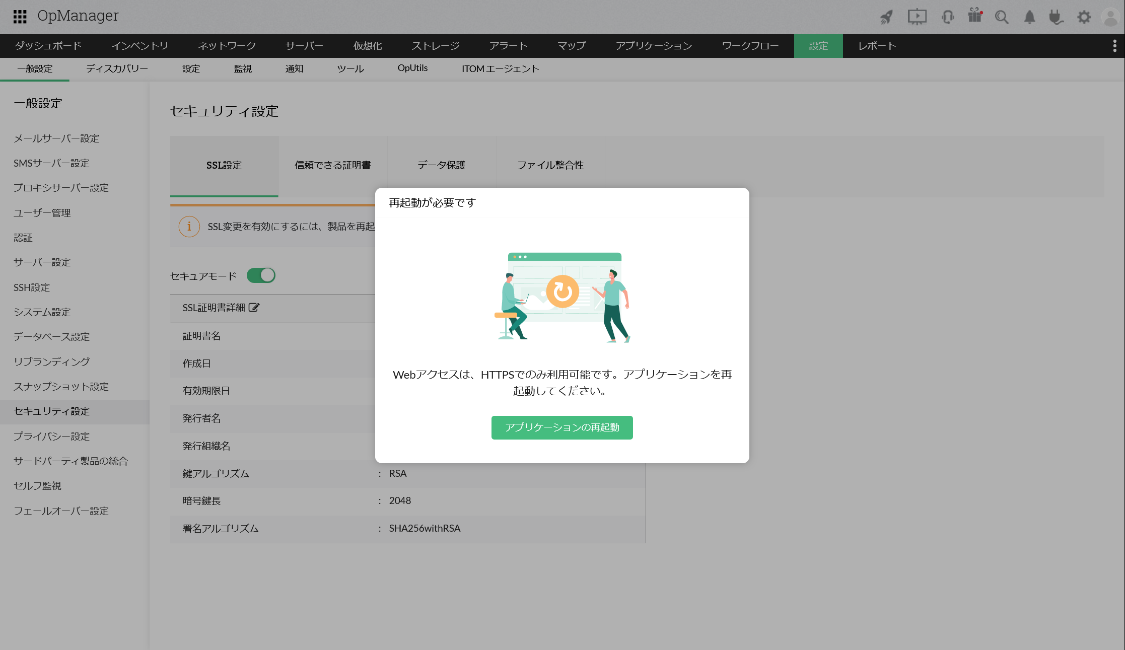 有効期限日など、内容に問題ないことを確認してください。自己署名証明書の期限は、生成してから27ヶ月(2年3ヶ月)です。 - 変更を反映するため、OpManagerを再起動します。