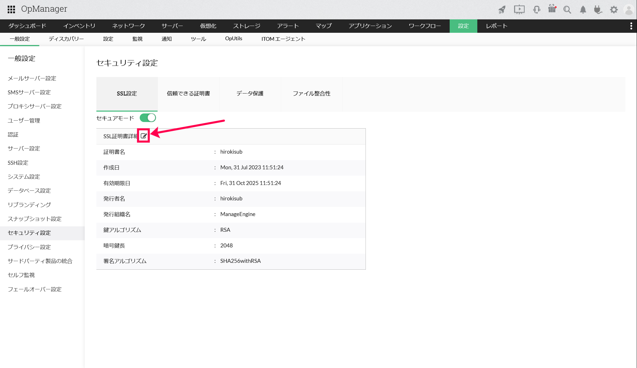 「SSL証明書詳細」の隣に表示される編集アイコン