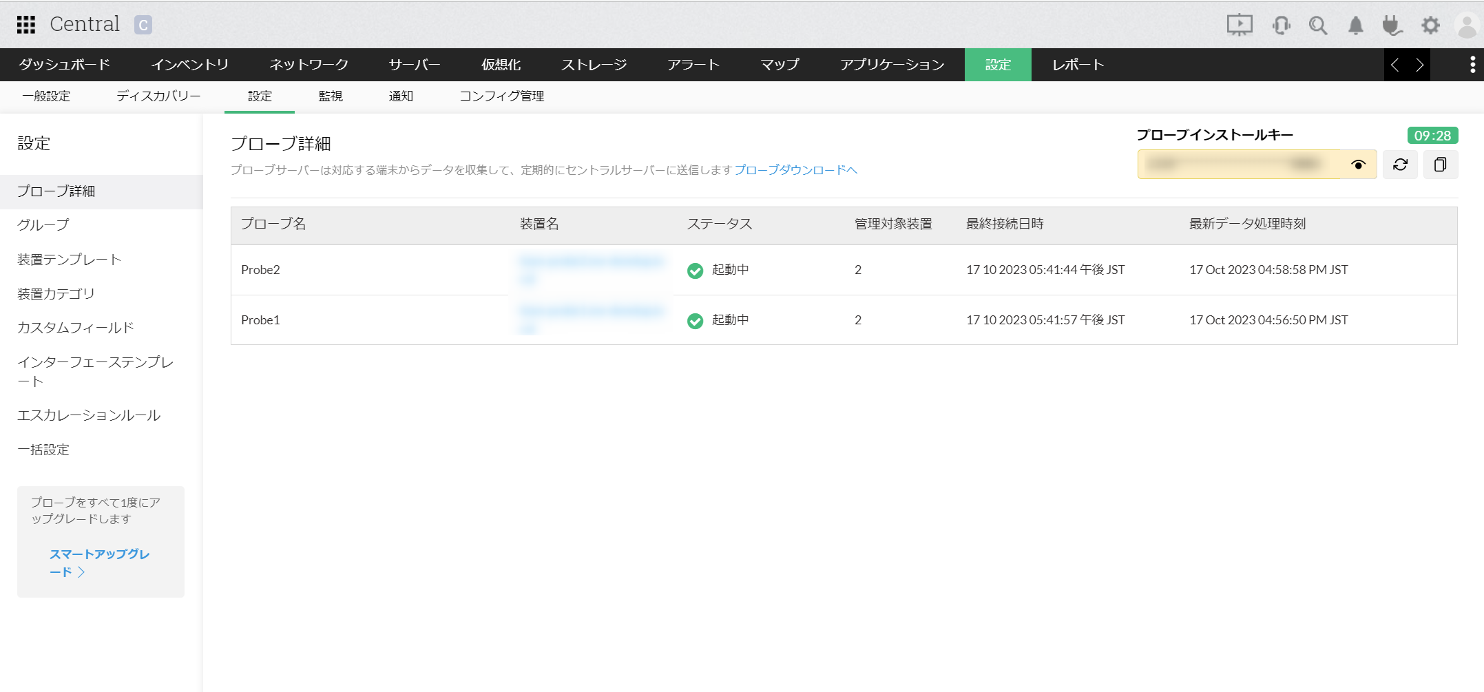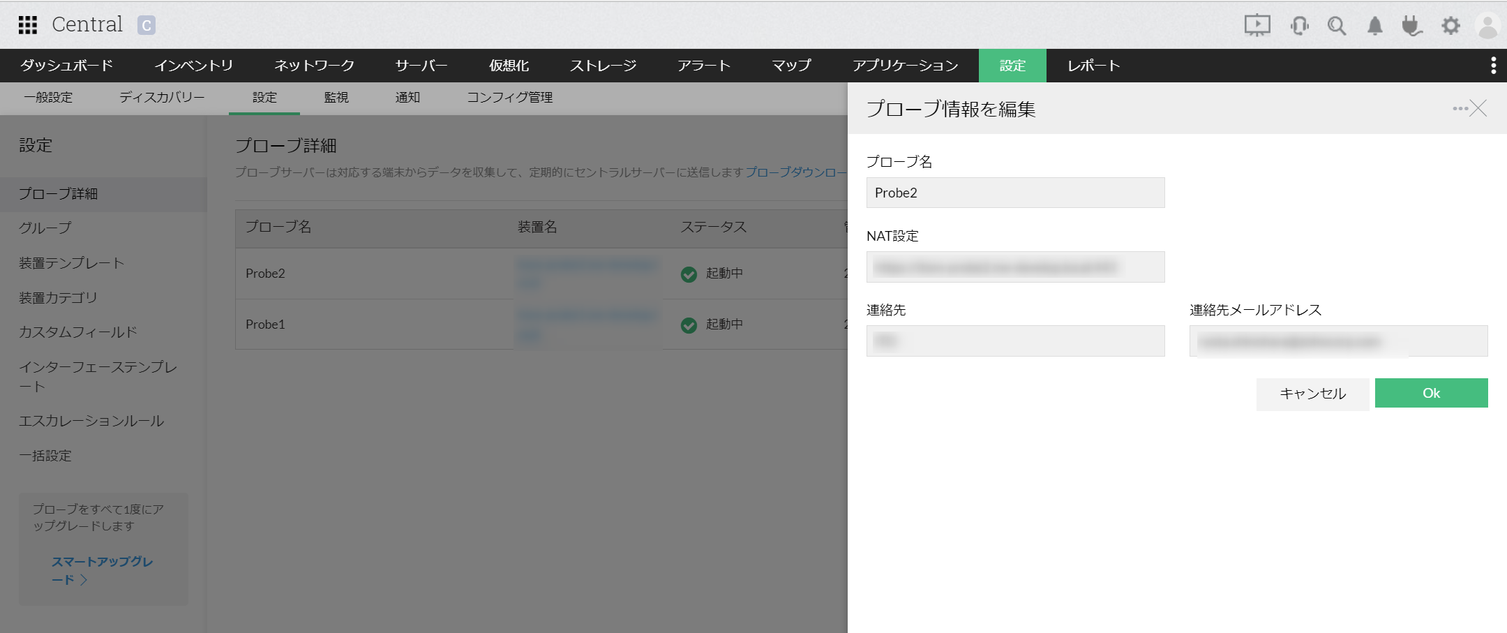 セントラルの[設定]→[設定]→[プローブ詳細]では、各プローブの構成情報に関する以下の設定を実施できます。