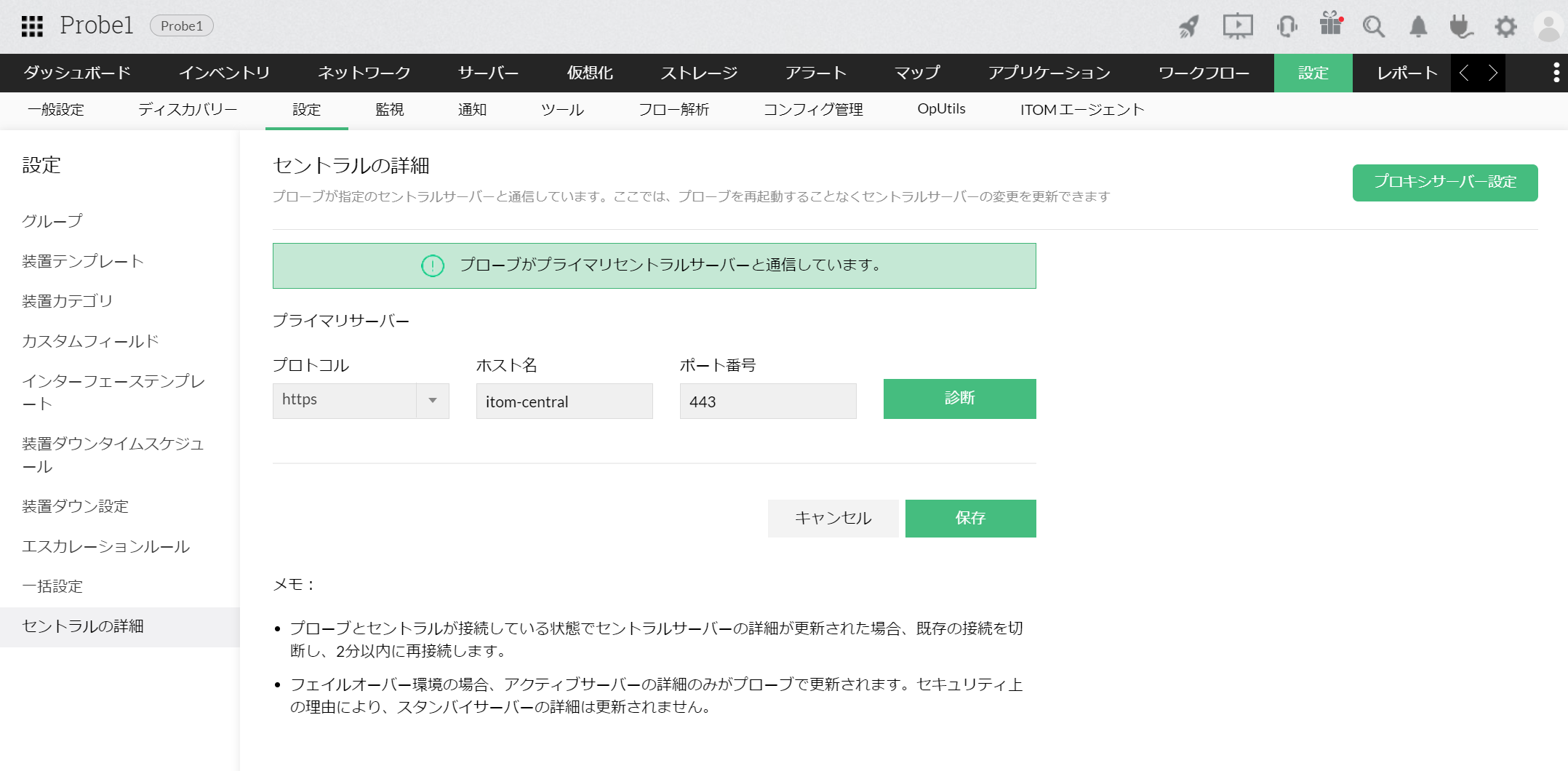 プローブの[設定]→[設定]→[セントラルの詳細]では、セントラルとの通信に関する以下の設定を実施できます。