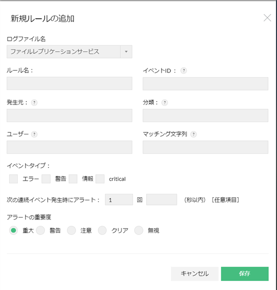 "3 回 300(秒以内)" と設定すると、このイベントログルールで指定したイベントログが、5分(300秒)以内に3回発生した場合にのみアラートを発報します。アラートの重要度 アラートの重要度を指定します。 [無視]を選択した場合、イベントログルールで指定したイベントログが発生しても、アラートは発報されません。
