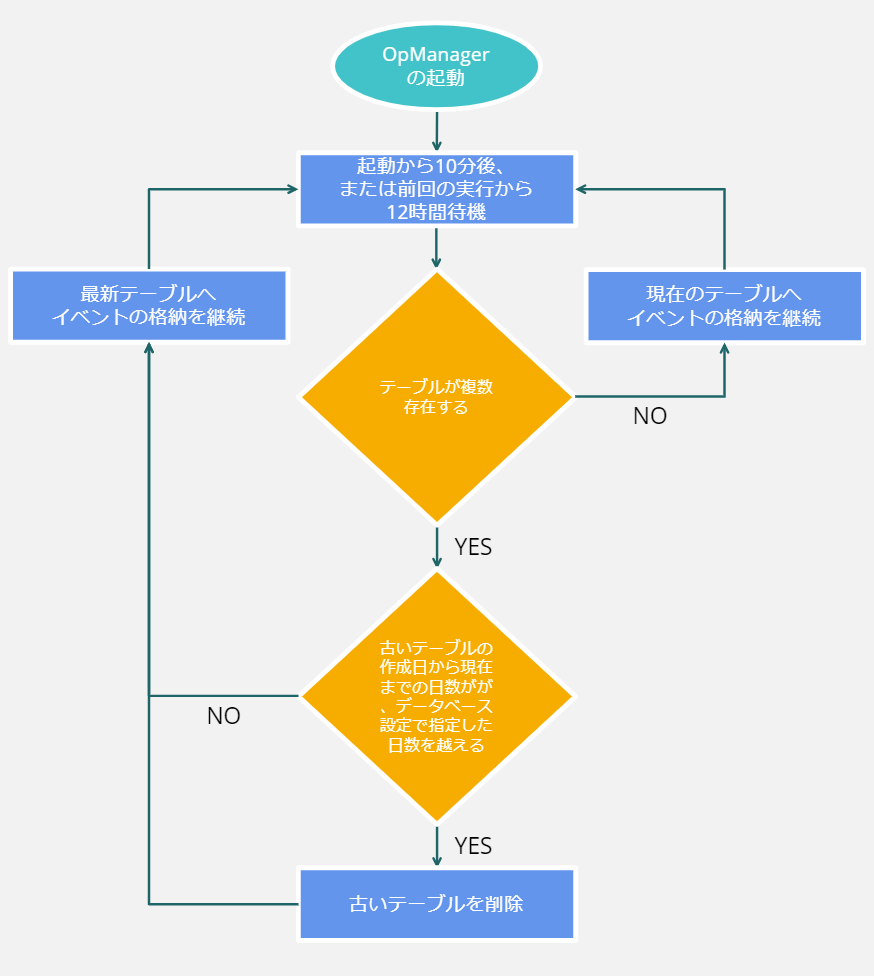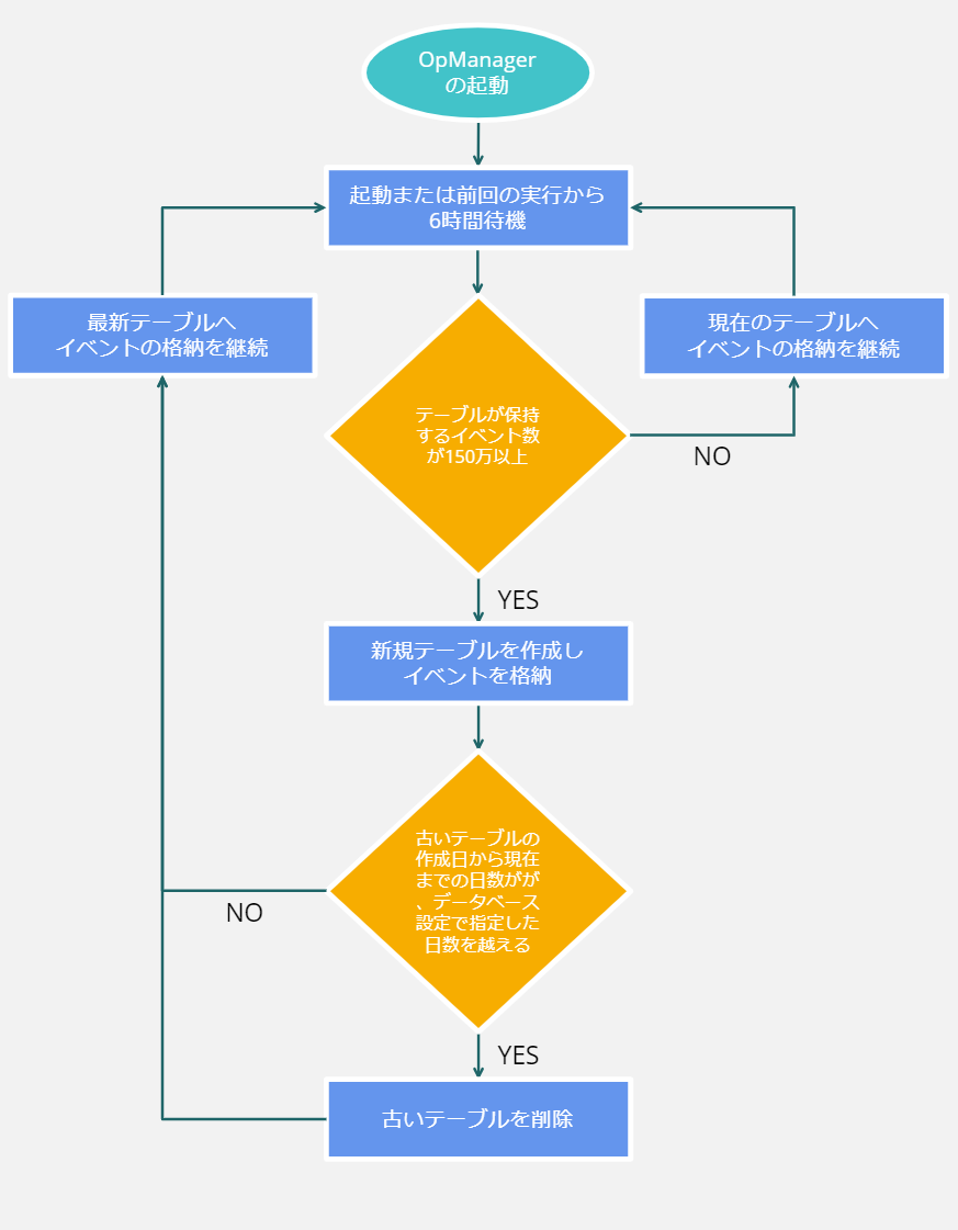 - 最新のイベントテーブルを除いて、データベース設定の[イベントの保存日数]で指定した日数よりも存在期間が長くなっている全てのイベントテーブルが削除されます。