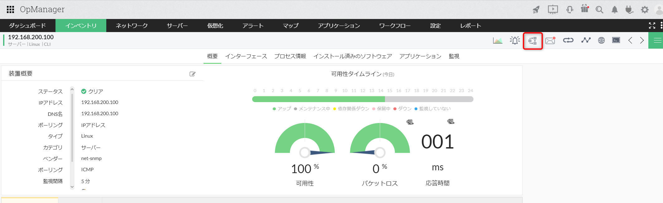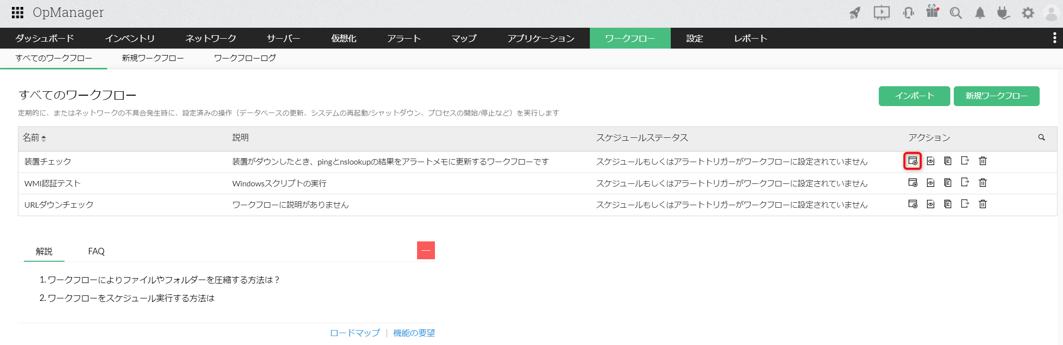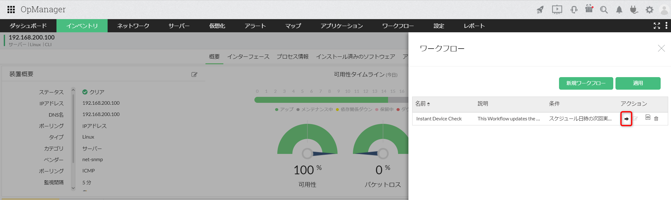 [インベントリ]からワークフローを実行する装置名をクリックし、ページ右上のワークフローアイコン