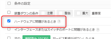 ハードウェア監視で発報されたアラートを外部に通知する場合、通知プロファイル設定の条件指定で以下の2点を選択します。