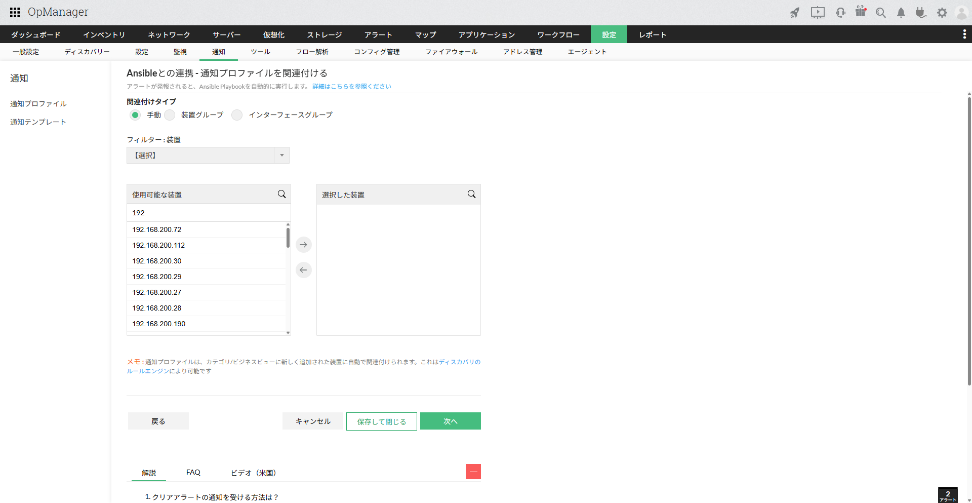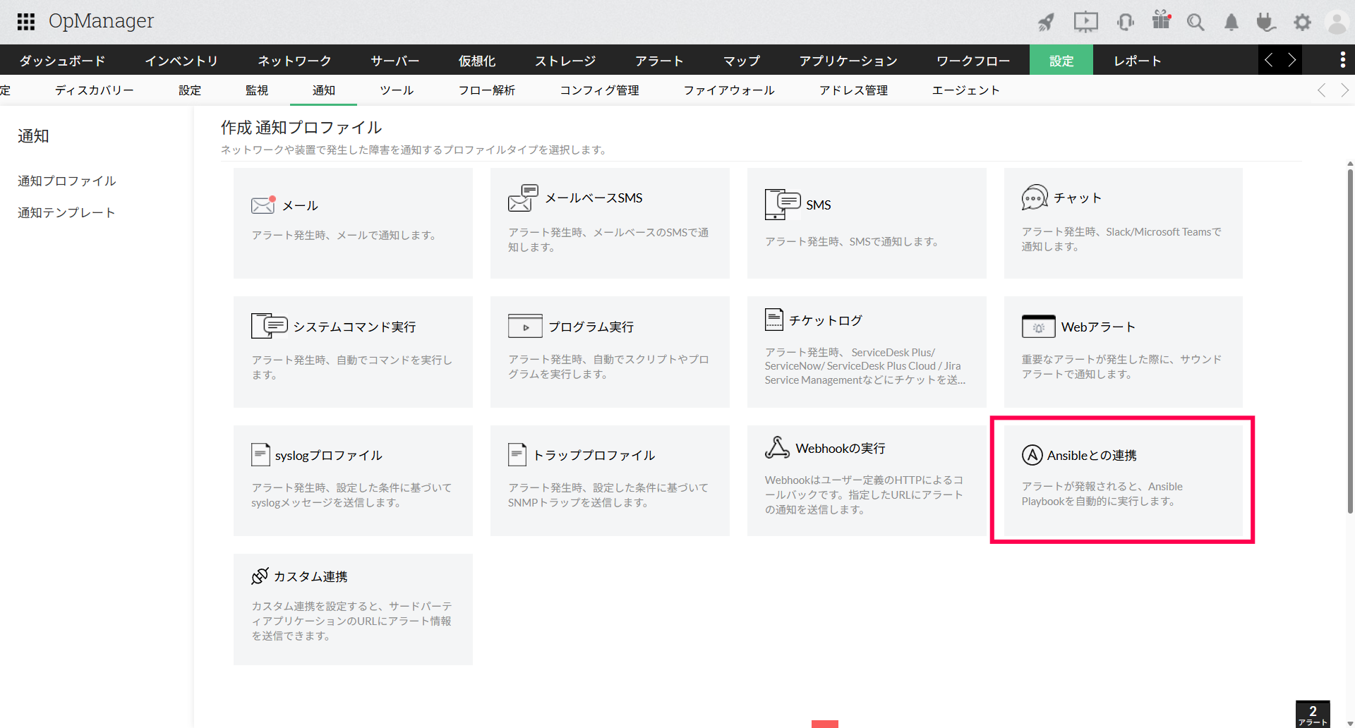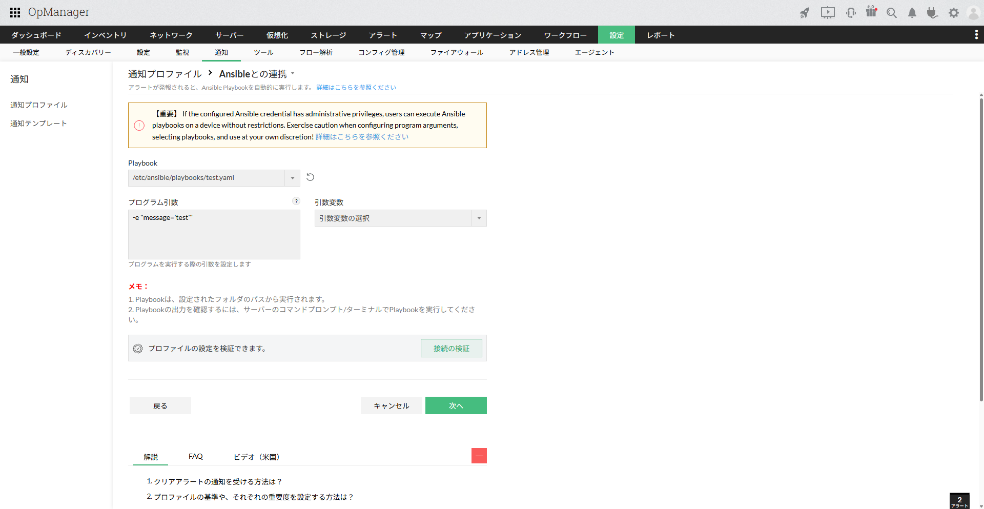 OpManagerで発生したアラートをもとにPlaybookを実行するには、通知プロファイルで対象アラートの条件と実行するPlaybookを指定します。