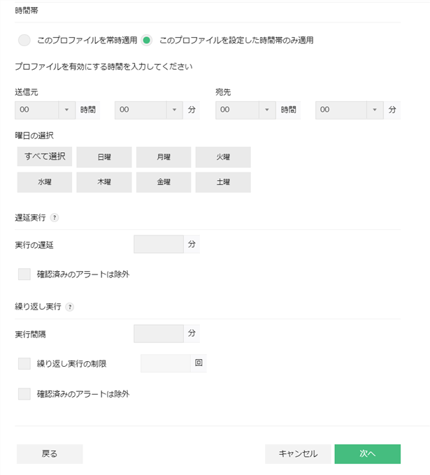 選択した時間外に発生したアラートは通知されません。「PM20:00から翌日AM5:00まで」のような日付をまたぐ設定をする場合、こちらをご確認ください。遅延実行の設定