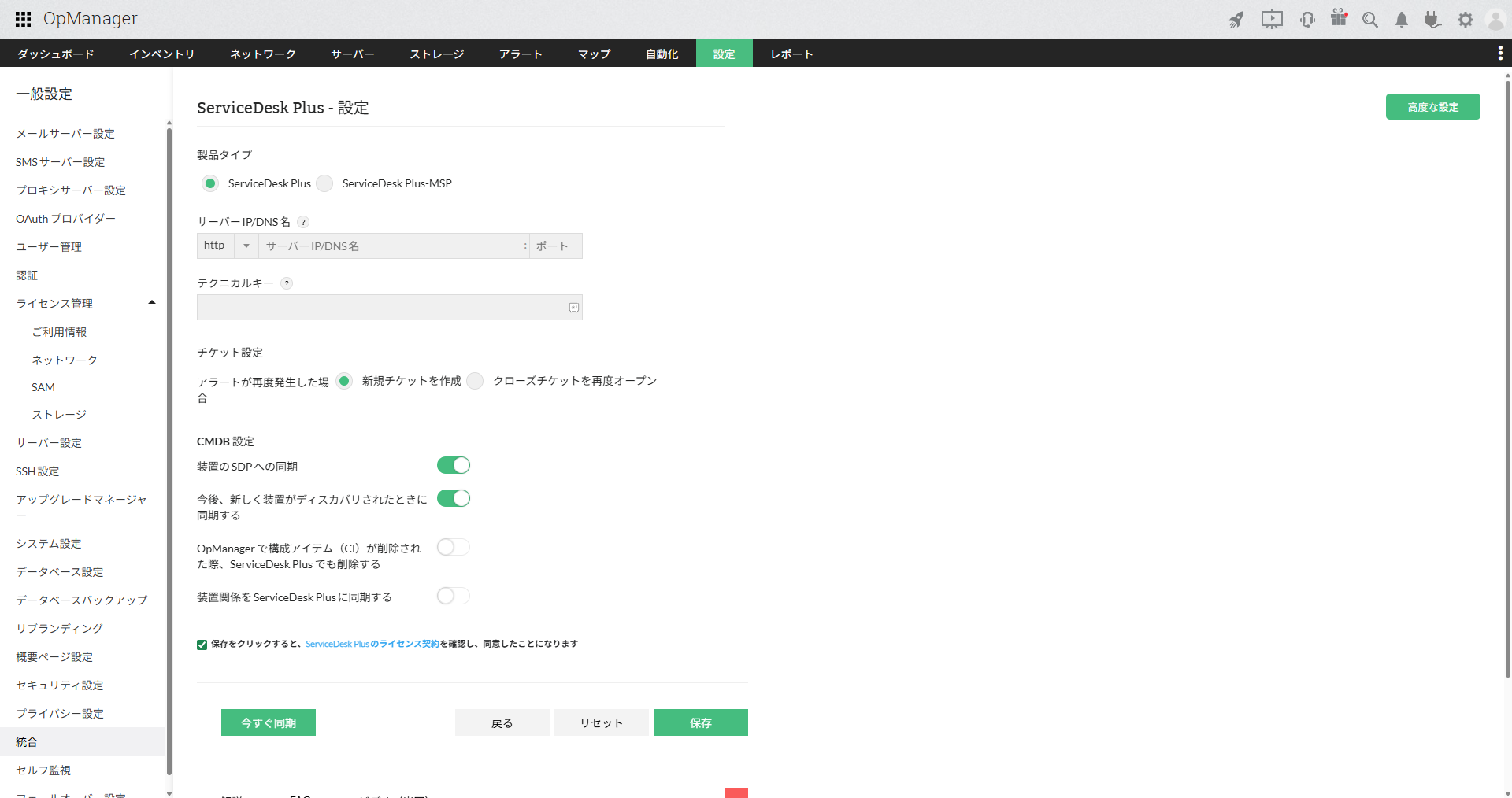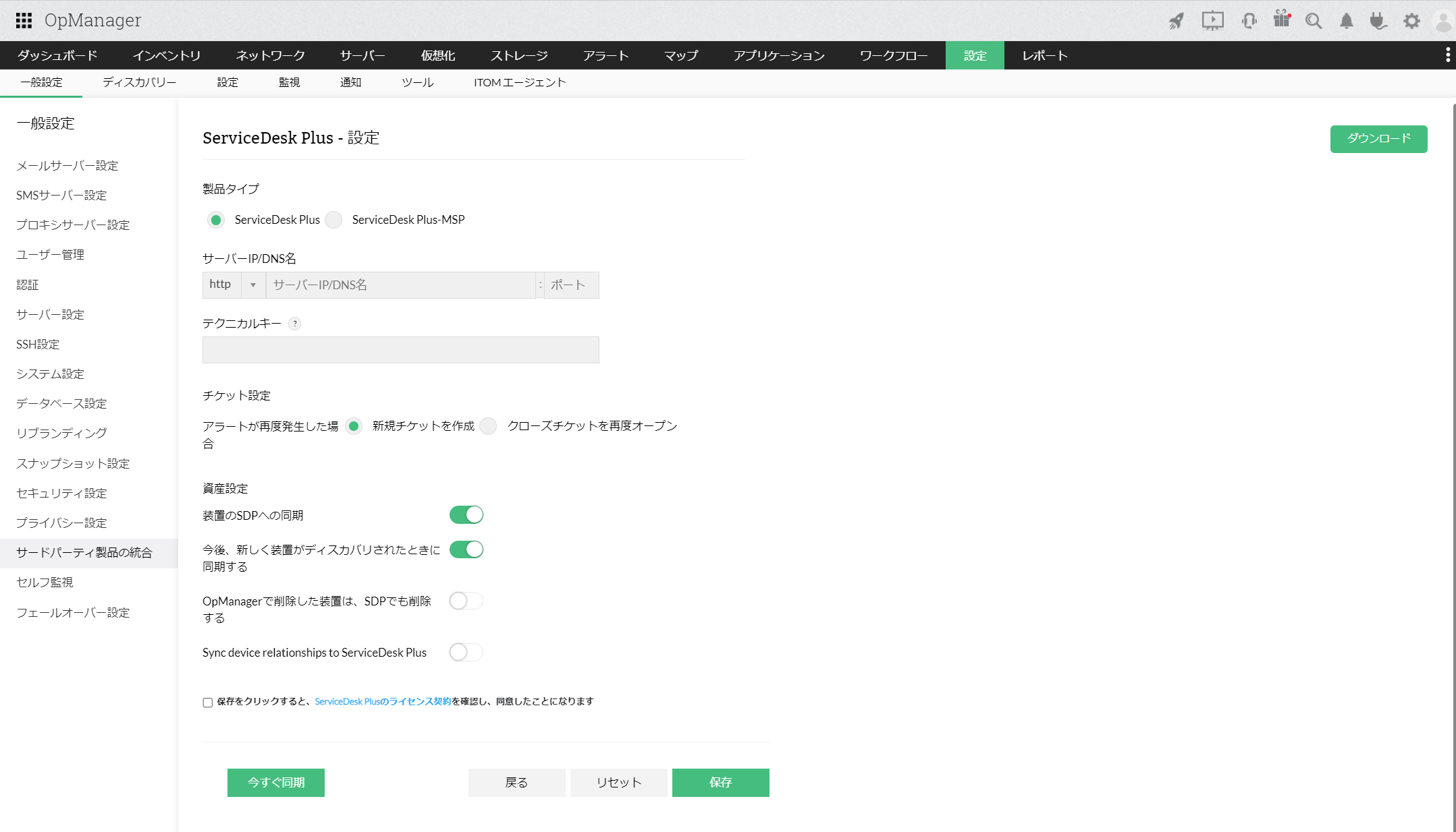 連携設定ページの[リセット](または[削除])をクリックすると、ServiceDesk Plusとの全ての連携情報がOpManagerから削除されます。