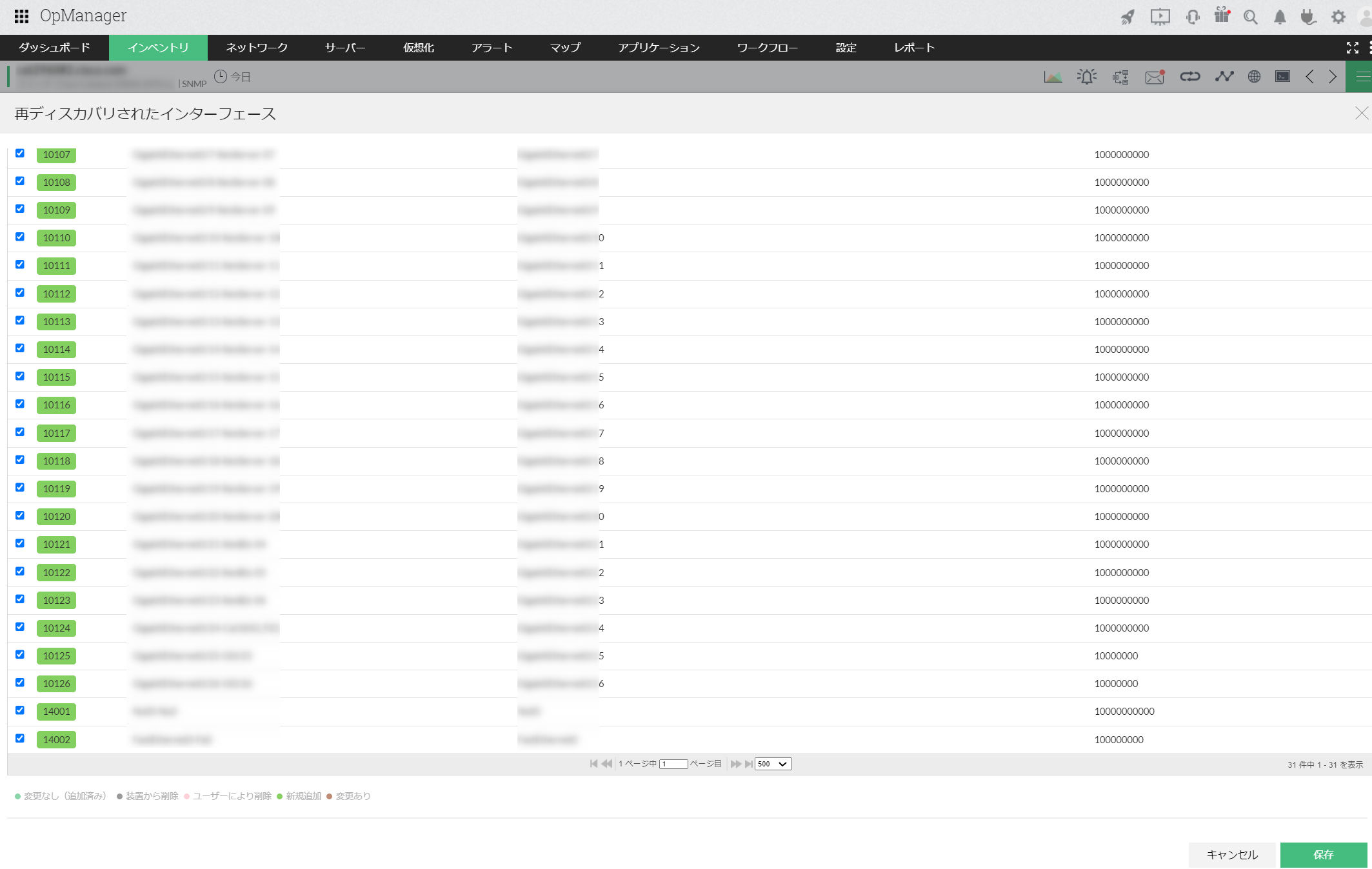 - ディスカバリーしたインターフェース一覧の中から、監視追加するインターフェースにチェックを入れ、画面右下の[保存]をクリックします。
