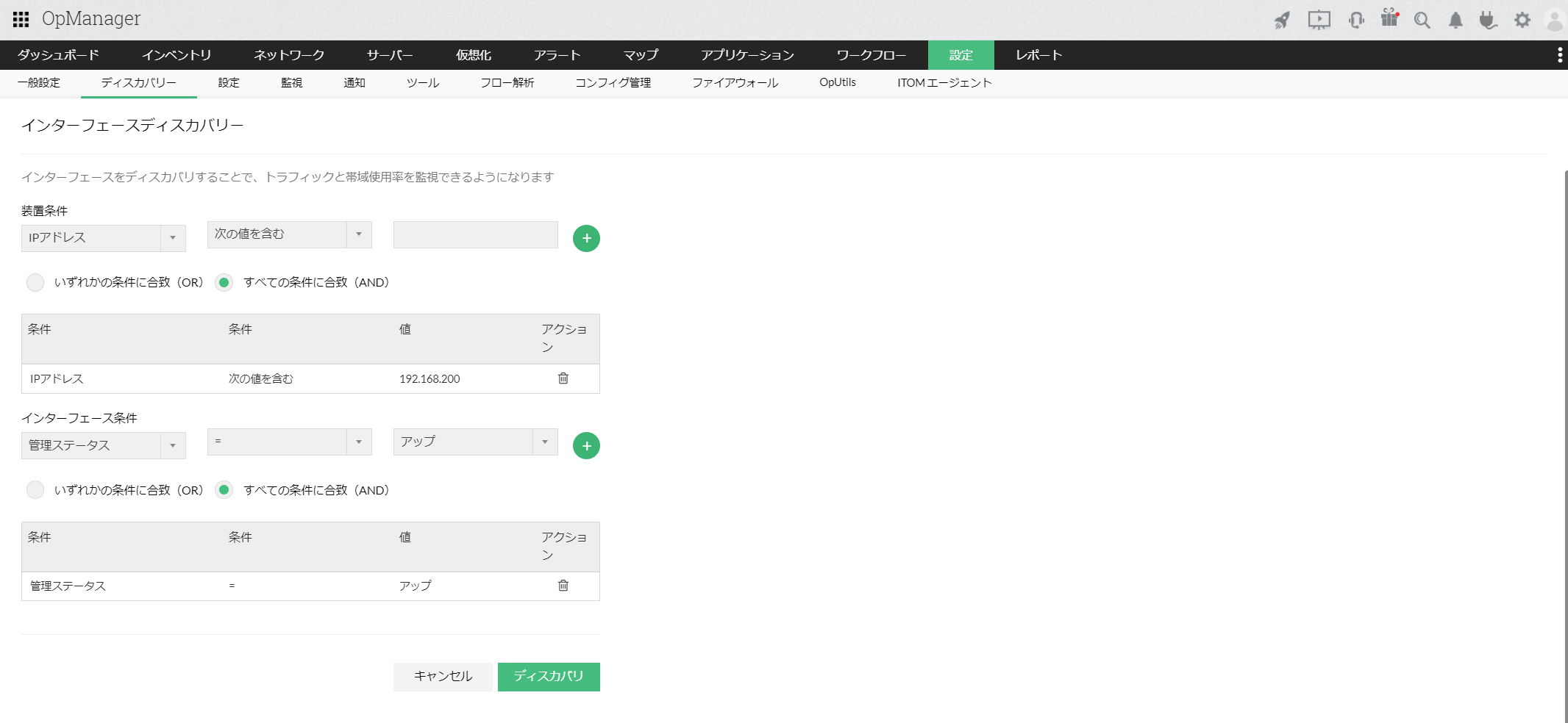 例:管理ステータスがアップのインターフェースを対象にする場合、左から順に[管理ステータス]、[=]、[アップ]と指定 - [ディスカバリー]をクリックします。