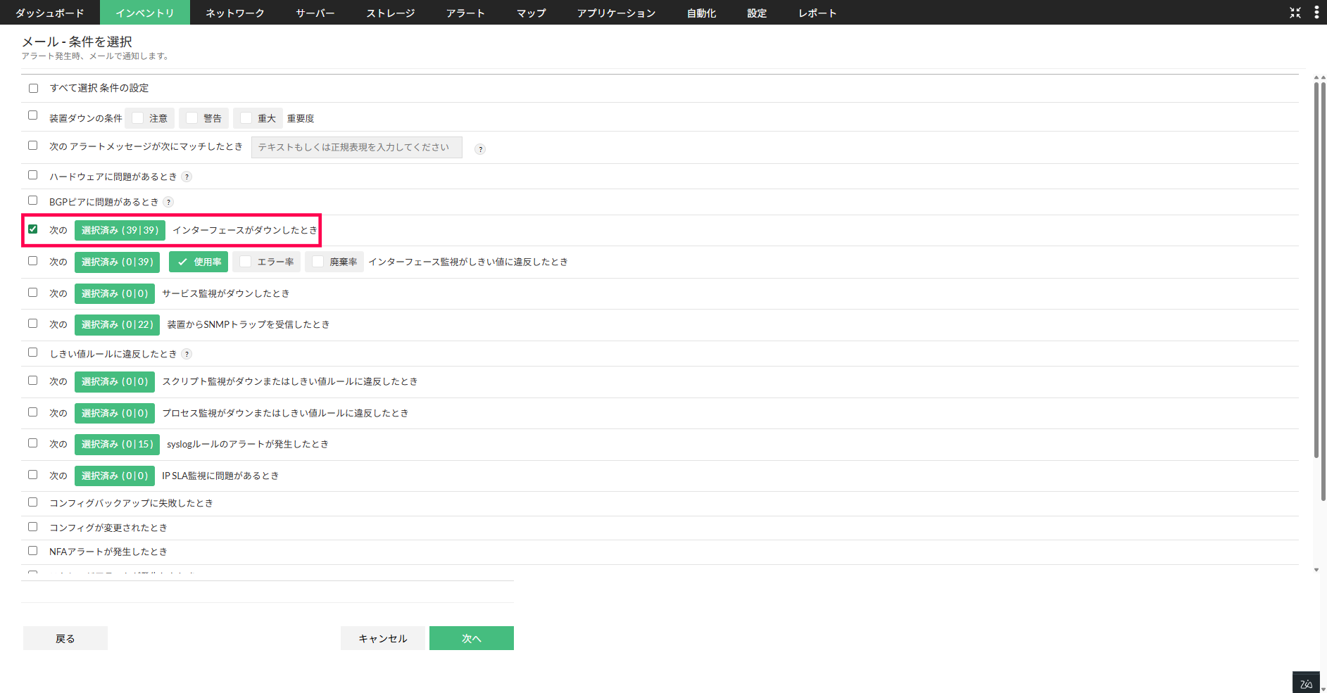 表示される通知条件のうち、「次のインターフェースがダウンしたとき」にチェックを入れます。