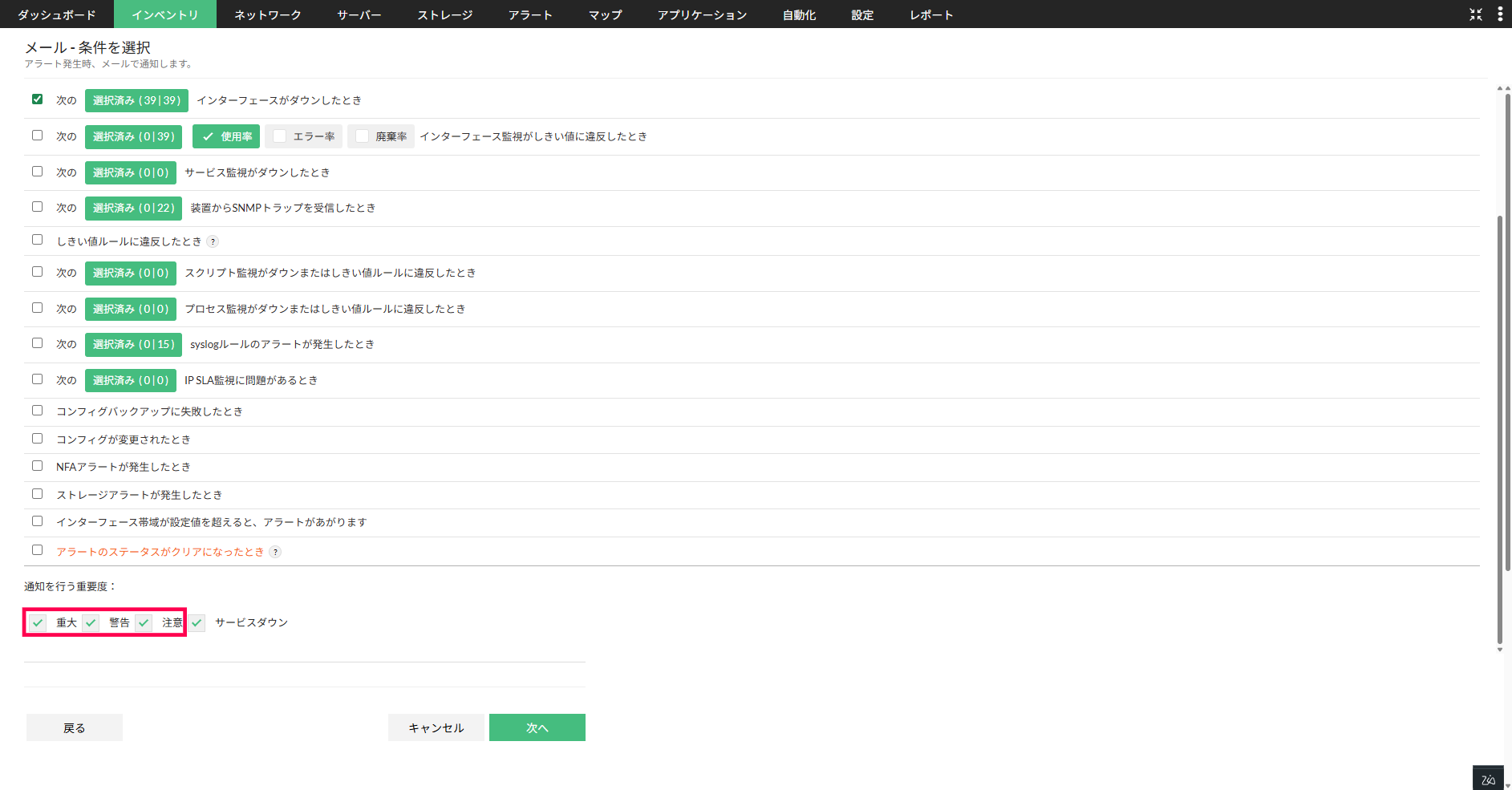 インターフェースのステータス監視から発生するアラートの重要度は、注意/警告/重大のいずれかです。詳細はこちらをご参照ください。