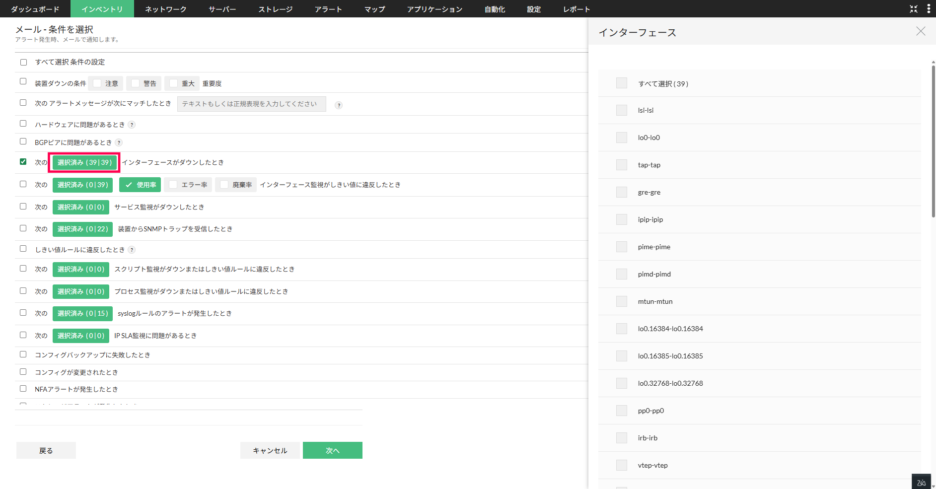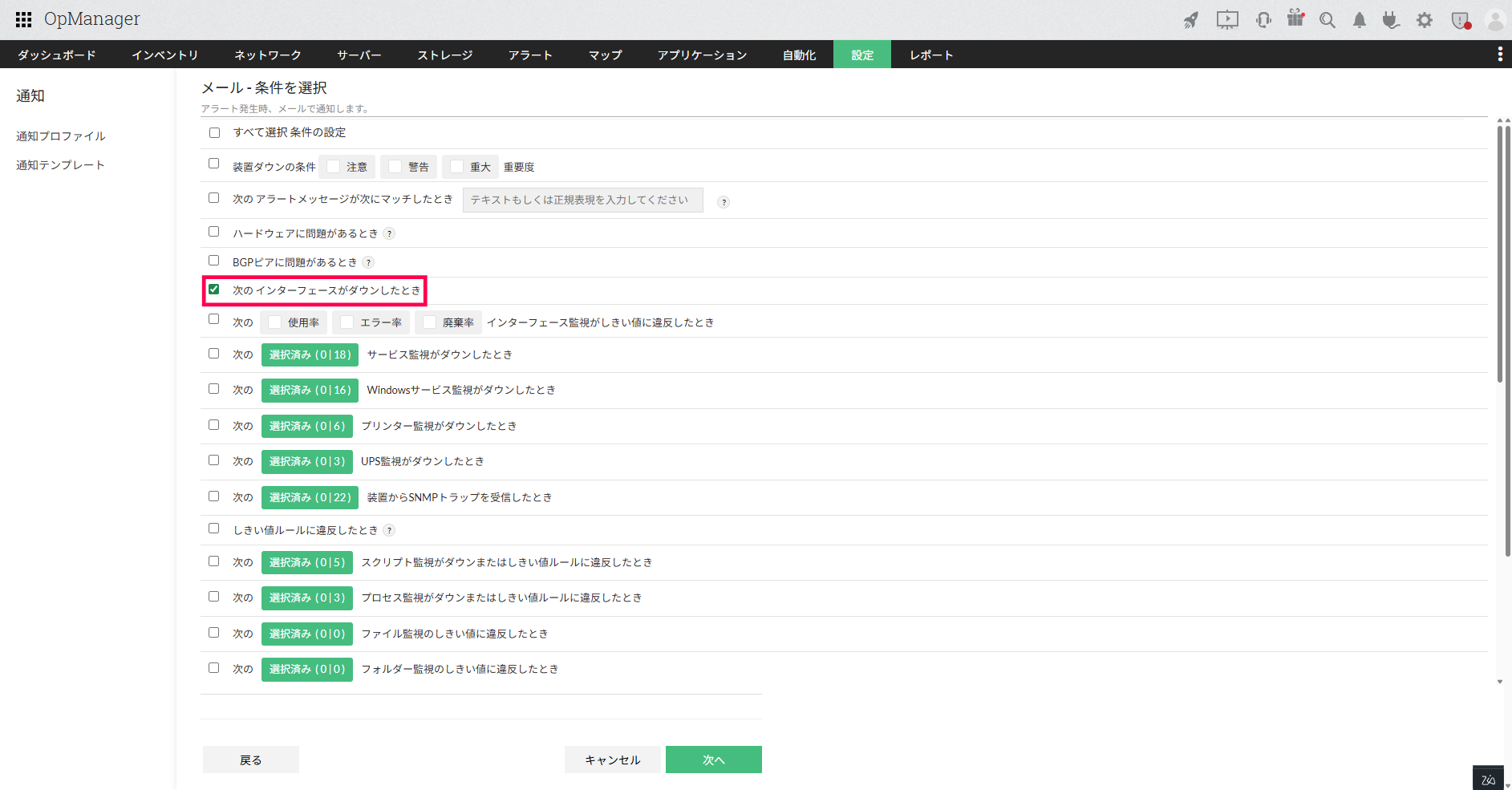 表示される通知条件のうち、「次の[選択済み]インターフェースがダウンしたとき」にチェックを入れます。