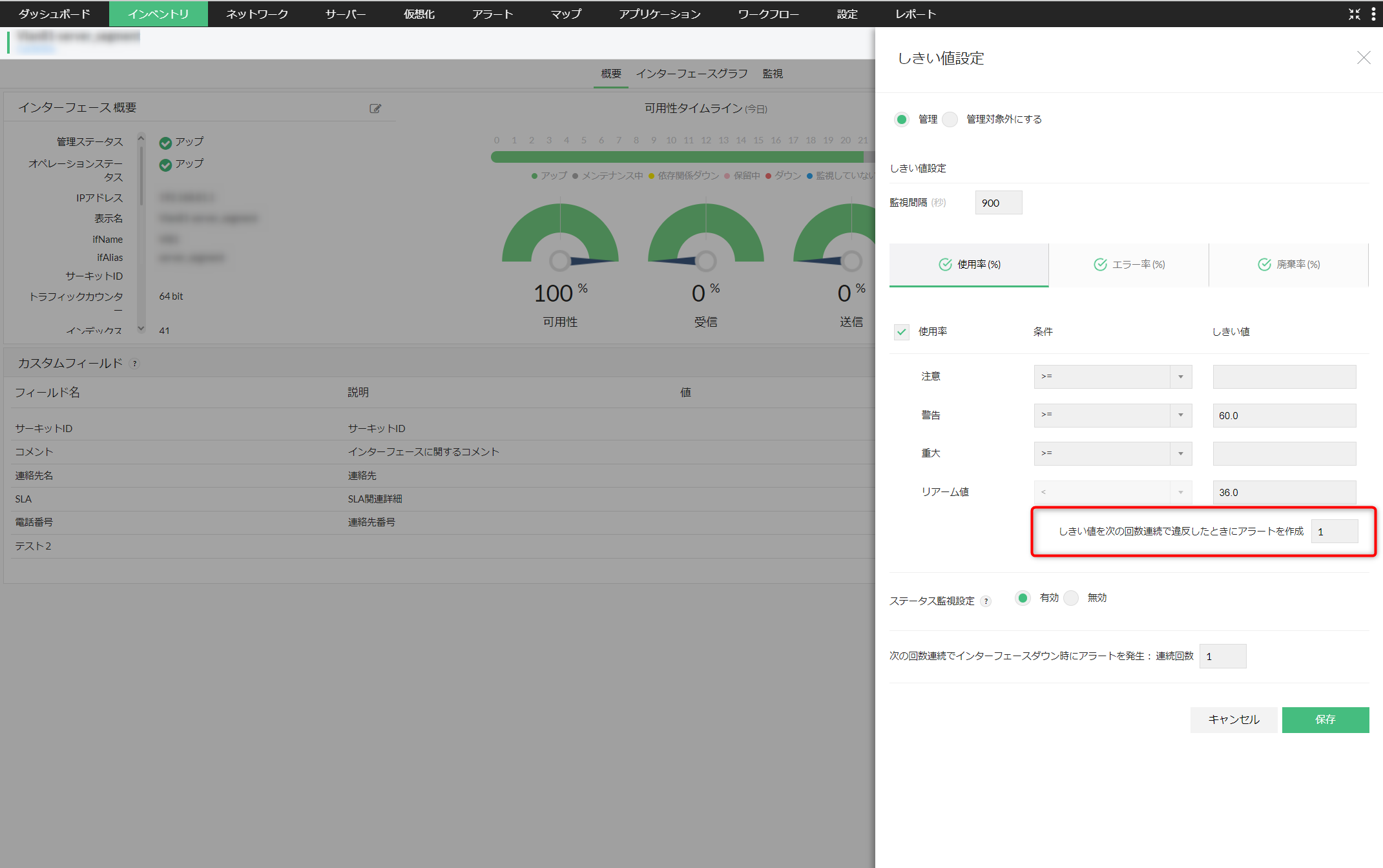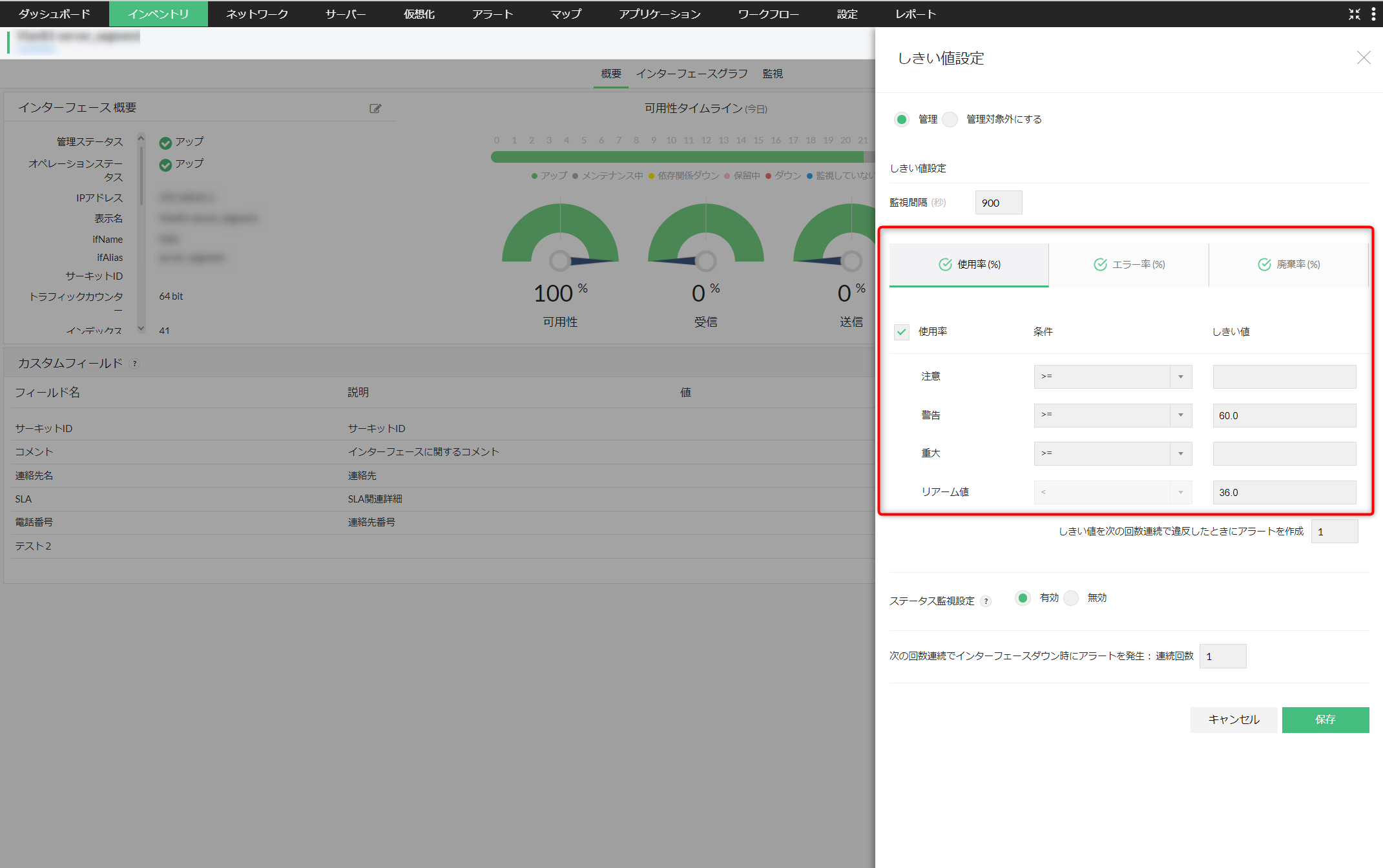 - [インターフェース帯域が設定値を超えると、アラートがあがります]