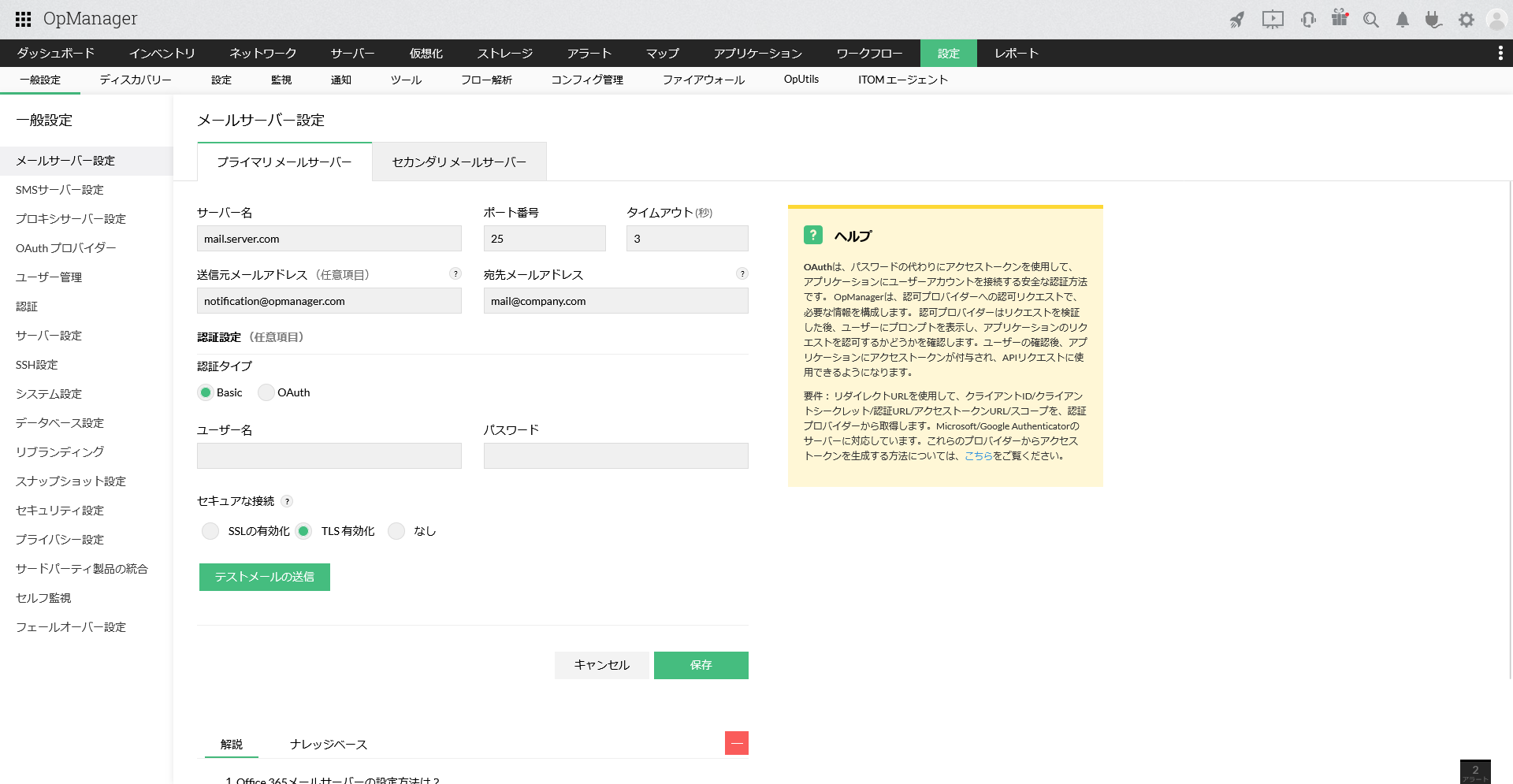 OpManagerでは、製品を円滑にご利用いただくため、使用するメールサーバーの設定が必須になっています。