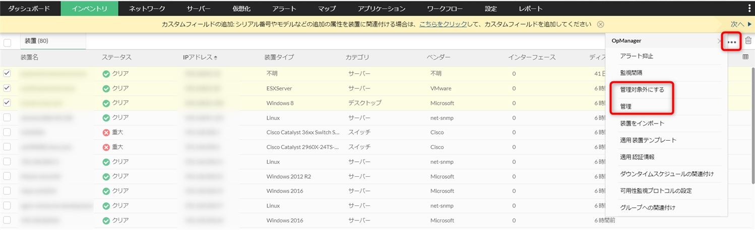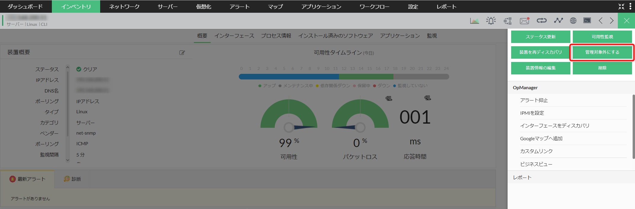 OpManagerは管理状態の対象にのみ監視を行い、非管理に設定されたものには監視を行いません。
