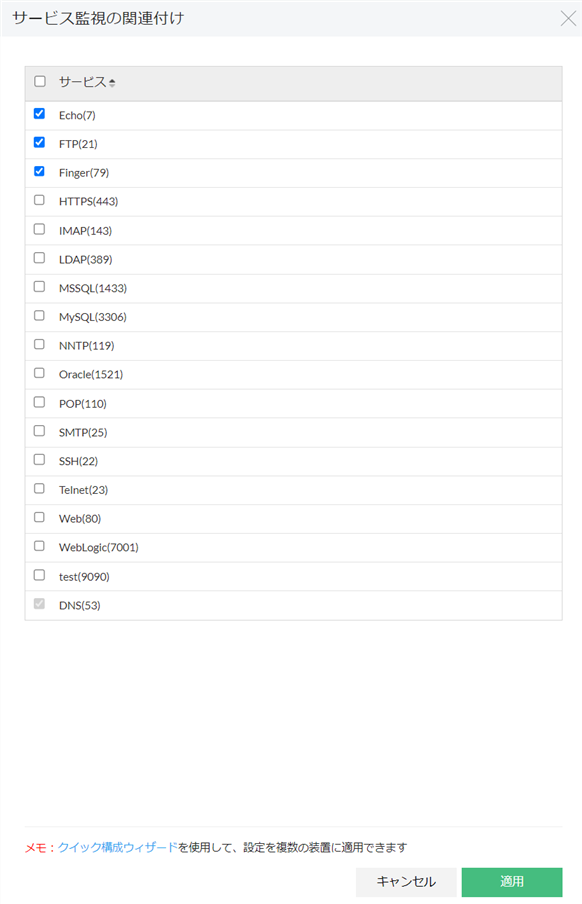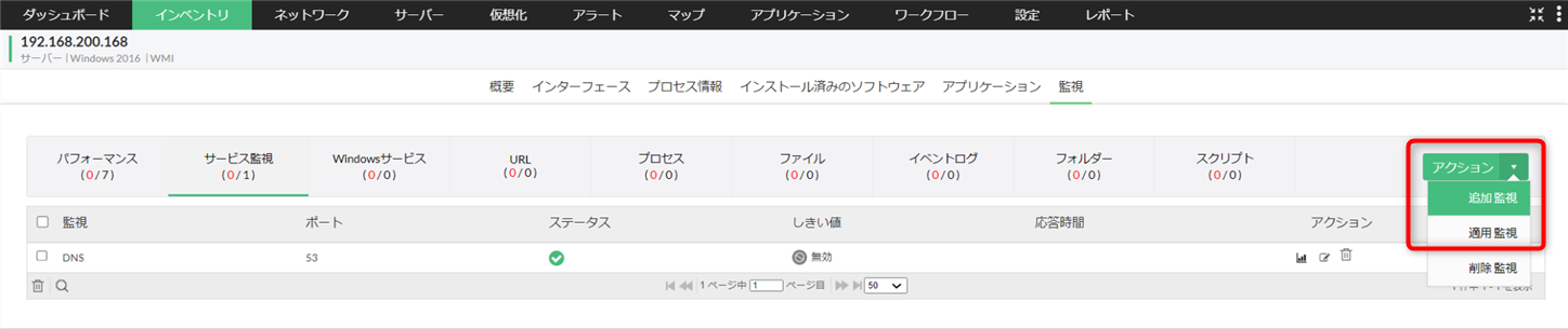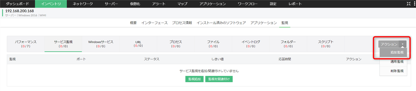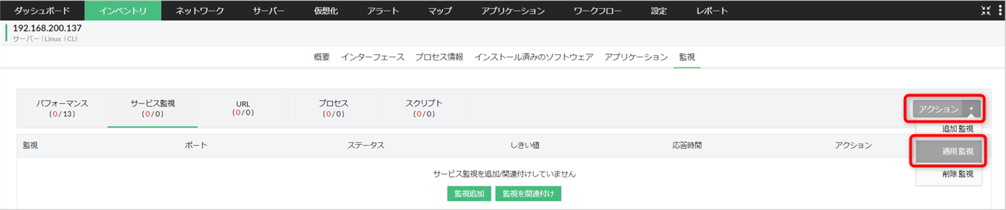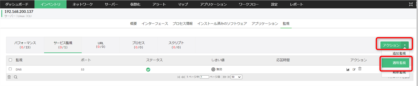 - [設定]→[監視]→[サービス]より右上の[適用]をクリックします。