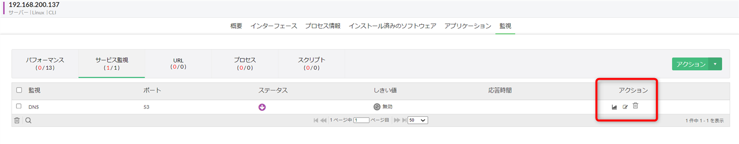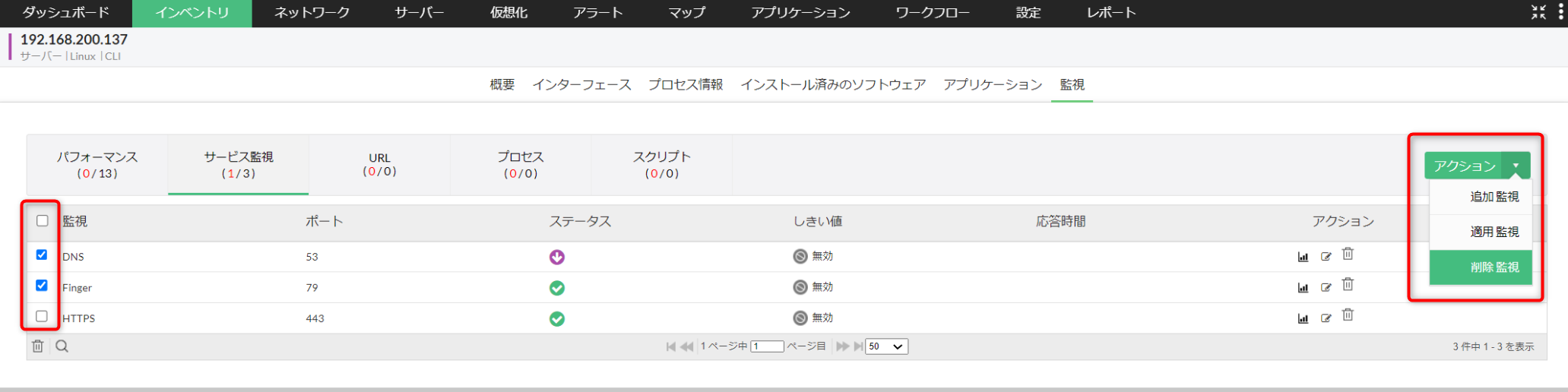 削除する監視名横のチェックボックスにチェックを入れて、[アクション]→[削除監視]をクリックします。