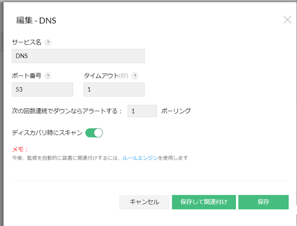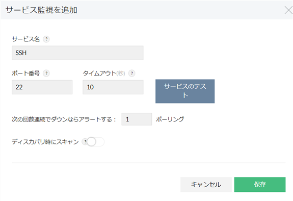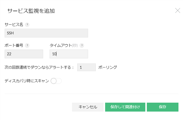 ポーリングの連続回数 指定した回数連続で応答できない場合、アラートを発報します。 ディスカバリー時にスキャン 有効にした場合、TCPサービスの自動スキャンを行います。