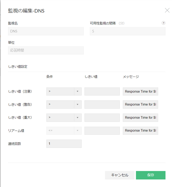 TCPサービス監視のしきい値設定方法は以下の通りです。 しきい値の概要はこちらをご参照ください。