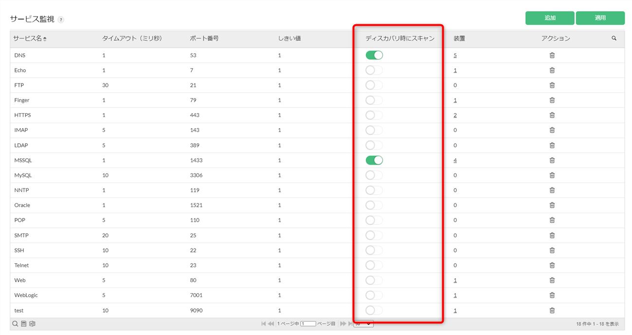 [設定]→[監視]→[サービス]に遷移し、有効にするサービス名の[ディスカバリー時にスキャン]カラムのラジオボタンをクリックします。